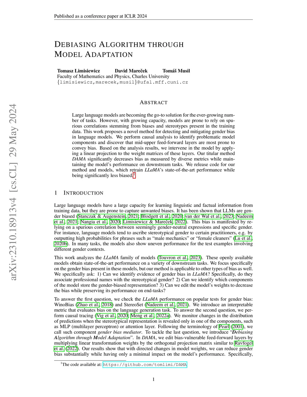 Large language models are becoming the go-to solution for the ever-growing number of tasks. However, with growing capacity, models are prone to rely on spurious correlations stemming from biases and stereotypes present in the training data. This work proposes a novel method for detecting and mitigating gender bias in language models. We perform causal analysis to identify problematic model components and discover that mid-upper feed-forward layers are most prone to convey bias. Based on the analysis results, we intervene in the model by applying a linear projection to the weight matrices of these layers. Our titular method, DAMA, significantly decreases bias as measured by diverse metrics while maintaining the model's performance on downstream tasks. We release code for our method and models, which retrain LLaMA's state-of-the-art performance while being significantly less biased.