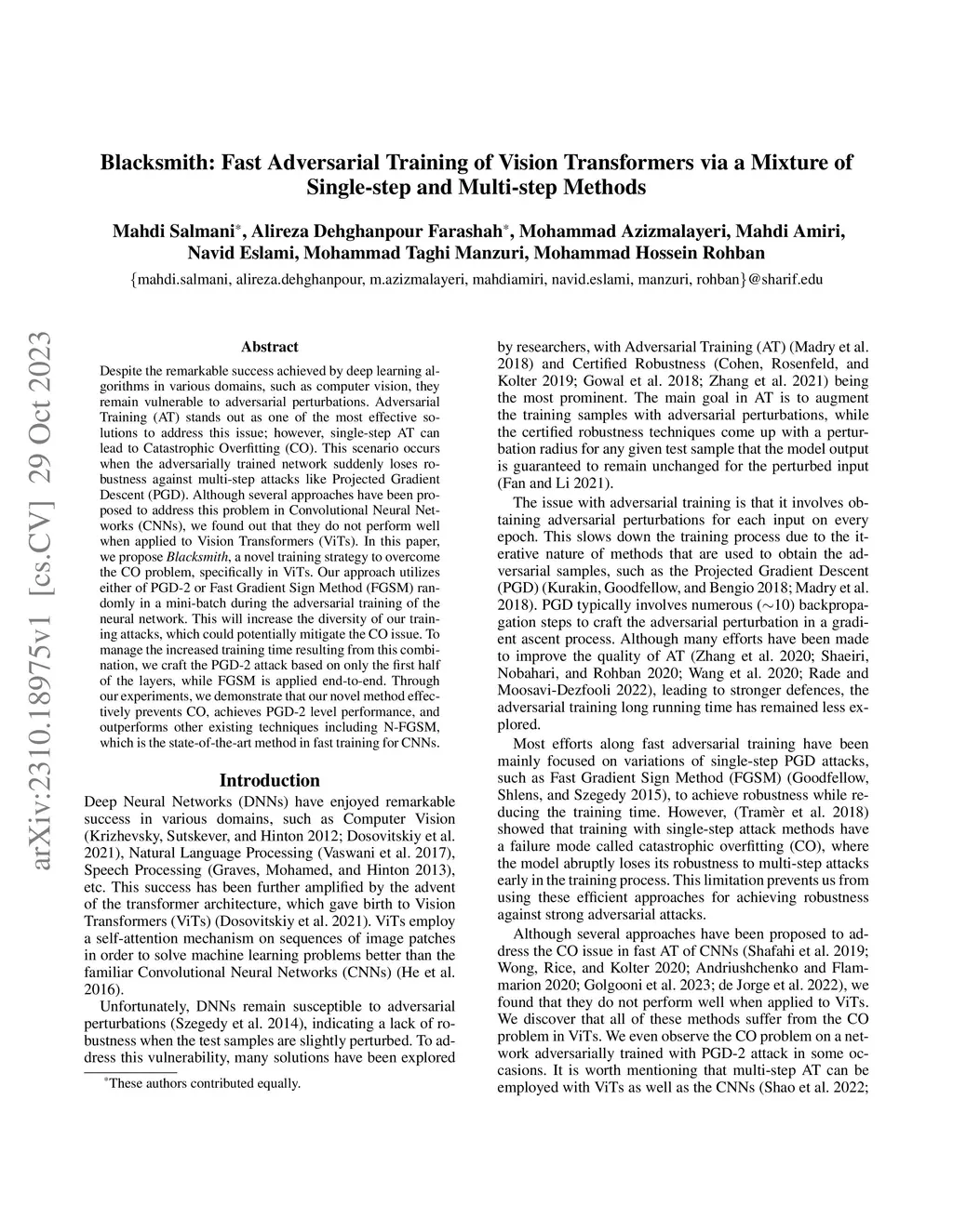Despite the remarkable success achieved by deep learning algorithms in various domains, such as computer vision, they remain vulnerable to adversarial perturbations. Adversarial Training (AT) stands out as one of the most effective solutions to address this issue; however, single-step AT can lead to Catastrophic Overfitting (CO). This scenario occurs when the adversarially trained network suddenly loses robustness against multi-step attacks like Projected Gradient Descent (PGD). Although several approaches have been proposed to address this problem in Convolutional Neural Networks (CNNs), we found out that they do not perform well when applied to Vision Transformers (ViTs). In this paper, we propose Blacksmith, a novel training strategy to overcome the CO problem, specifically in ViTs. Our approach utilizes either of PGD-2 or Fast Gradient Sign Method (FGSM) randomly in a mini-batch during the adversarial training of the neural network. This will increase the diversity of our training attacks, which could potentially mitigate the CO issue. To manage the increased training time resulting from this combination, we craft the PGD-2 attack based on only the first half of the layers, while FGSM is applied end-to-end. Through our experiments, we demonstrate that our novel method effectively prevents CO, achieves PGD-2 level performance, and outperforms other existing techniques including N-FGSM, which is the state-of-the-art method in fast training for CNNs.