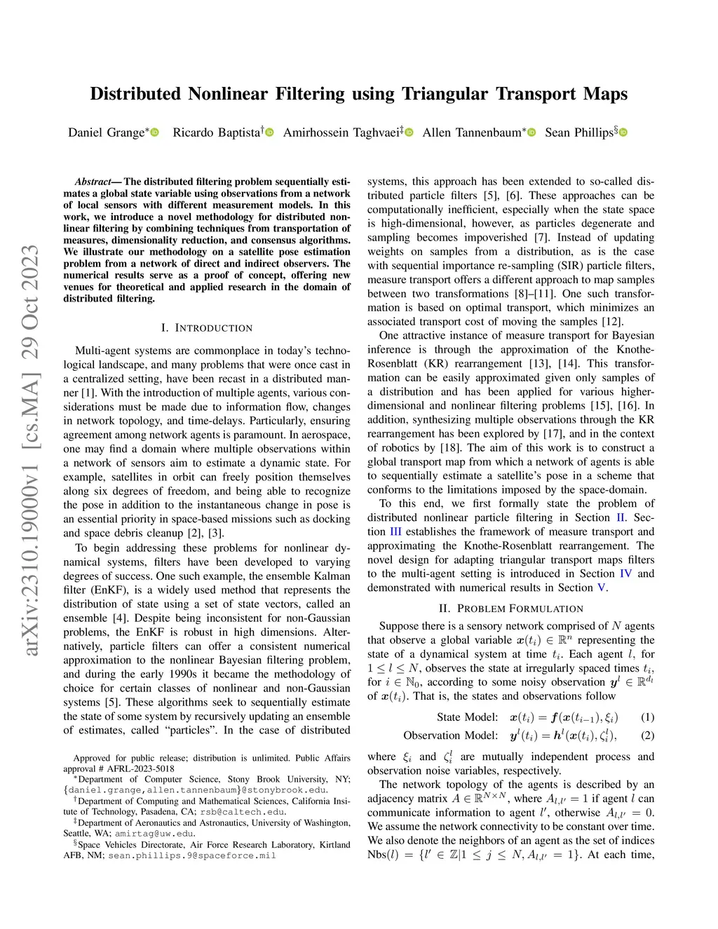 The distributed filtering problem sequentially estimates a global state variable using observations from a network of local sensors with different measurement models. In this work, we introduce a novel methodology for distributed nonlinear filtering by combining techniques from transportation of measures, dimensionality reduction, and consensus algorithms. We illustrate our methodology on a satellite pose estimation problem from a network of direct and indirect observers. The numerical results serve as a proof of concept, offering new venues for theoretical and applied research in the domain of distributed filtering.
