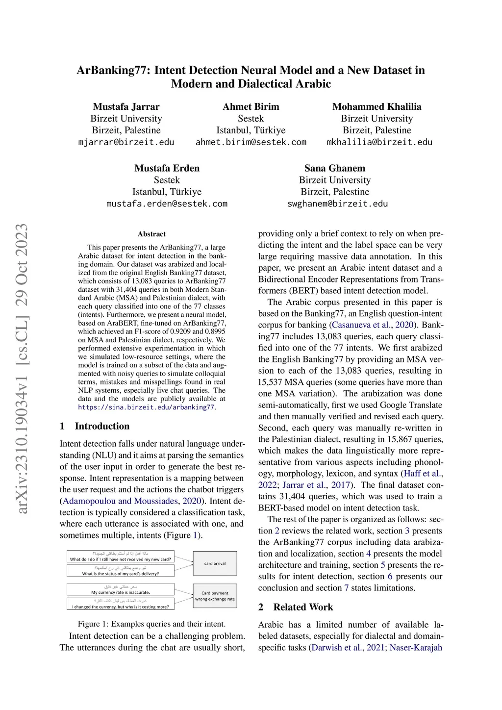 ArBanking77: Intent Detection Neural Model and a New Dataset in Modern