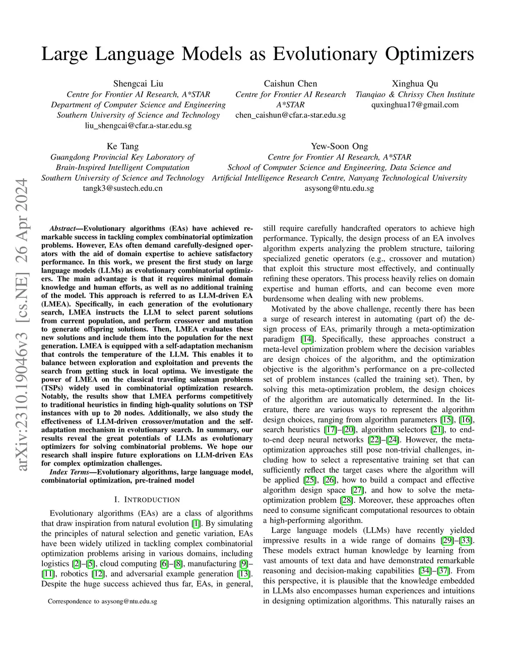 Evolutionary algorithms (EAs) have achieved remarkable success in tackling complex combinatorial optimization problems. However, EAs often demand carefully-designed operators with the aid of domain expertise to achieve satisfactory performance. In this work, we present the first study on large language models (LLMs) as evolutionary combinatorial optimizers. The main advantage is that it requires minimal domain knowledge and human efforts, as well as no additional training of the model. This approach is referred to as LLM-driven EA (LMEA). Specifically, in each generation of the evolutionary search, LMEA instructs the LLM to select parent solutions from current population, and perform crossover and mutation to generate offspring solutions. Then, LMEA evaluates these new solutions and include them into the population for the next generation. LMEA is equipped with a self-adaptation mechanism that controls the temperature of the LLM. This enables it to balance between exploration and exploitation and prevents the search from getting stuck in local optima. We investigate the power of LMEA on the classical traveling salesman problems (TSPs) widely used in combinatorial optimization research. Notably, the results show that LMEA performs competitively to traditional heuristics in finding high-quality solutions on TSP instances with up to 20 nodes. Additionally, we also study the effectiveness of LLM-driven crossover/mutation and the self-adaptation mechanism in evolutionary search. In summary, our results reveal the great potentials of LLMs as evolutionary optimizers for solving combinatorial problems. We hope our research shall inspire future explorations on LLM-driven EAs for complex optimization challenges.
