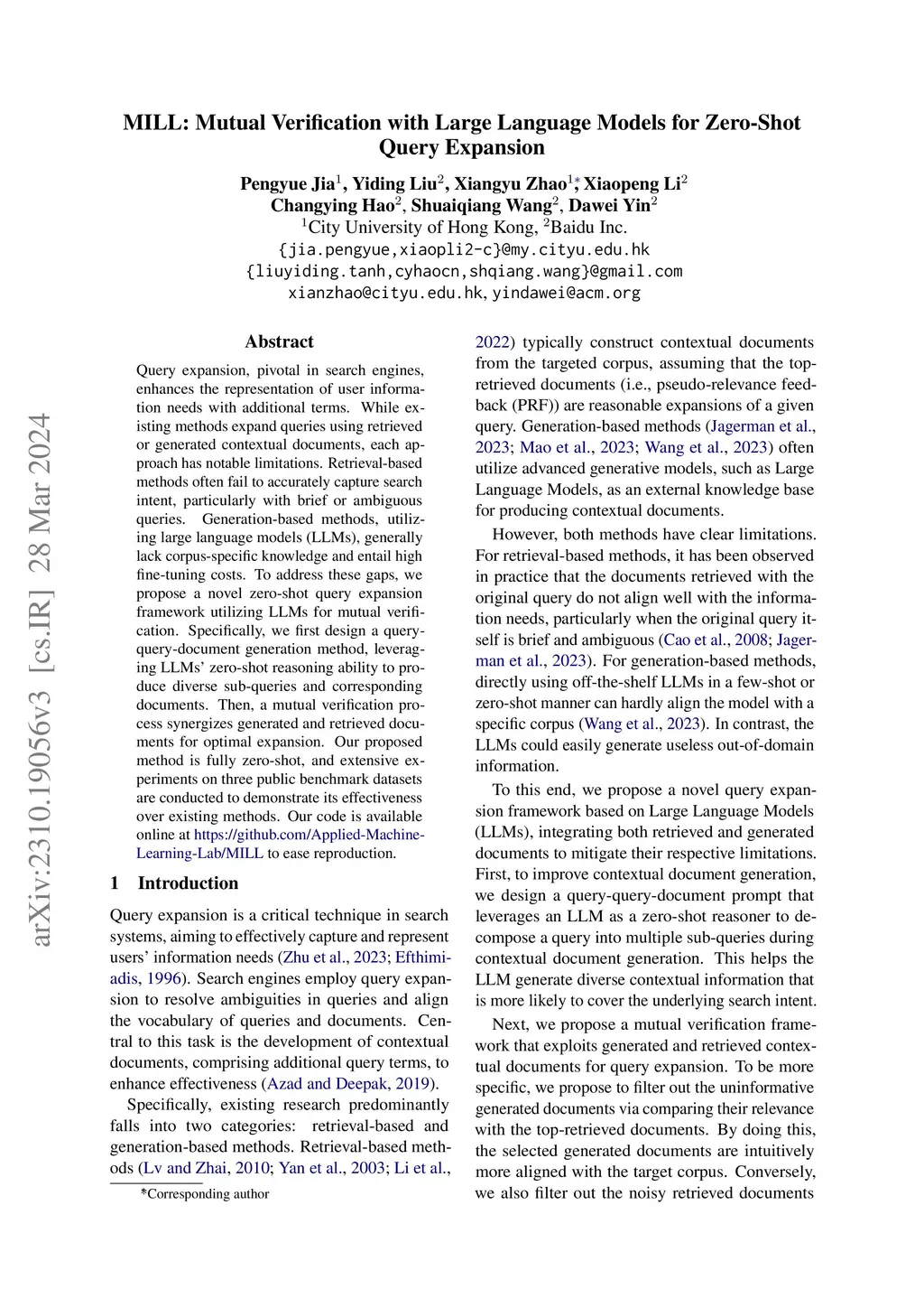 Query expansion, pivotal in search engines, enhances the representation of user information needs with additional terms. While existing methods expand queries using retrieved or generated contextual documents, each approach has notable limitations. Retrieval-based methods often fail to accurately capture search intent, particularly with brief or ambiguous queries. Generation-based methods, utilizing large language models (LLMs), generally lack corpus-specific knowledge and entail high fine-tuning costs. To address these gaps, we propose a novel zero-shot query expansion framework utilizing LLMs for mutual verification. Specifically, we first design a query-query-document generation method, leveraging LLMs' zero-shot reasoning ability to produce diverse sub-queries and corresponding documents. Then, a mutual verification process synergizes generated and retrieved documents for optimal expansion. Our proposed method is fully zero-shot, and extensive experiments on three public benchmark datasets are conducted to demonstrate its effectiveness over existing methods. Our code is available online at https://github.com/Applied-Machine-Learning-Lab/MILL to ease reproduction.