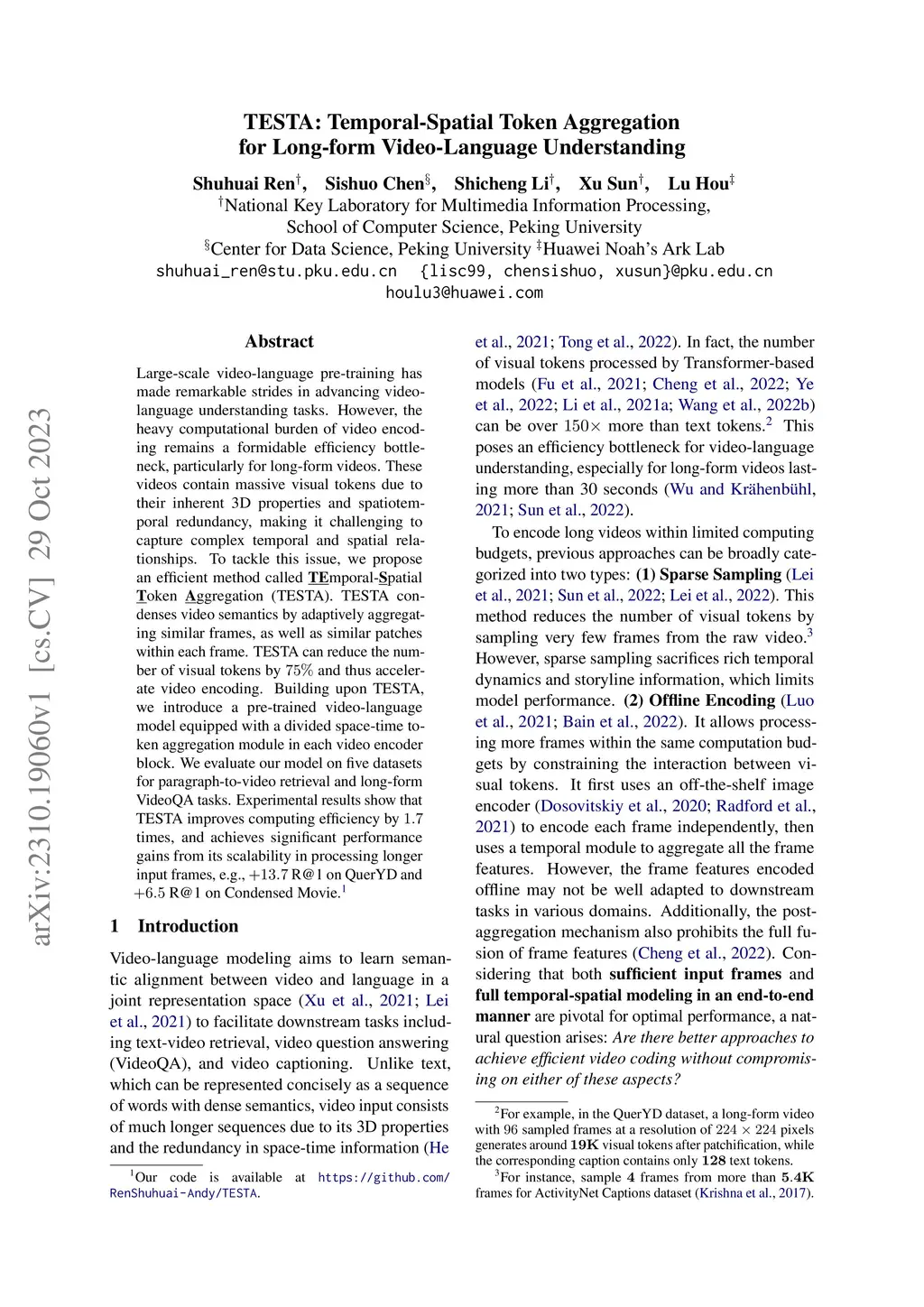 Large-scale video-language pre-training has made remarkable strides in advancing video-language understanding tasks. However, the heavy computational burden of video encoding remains a formidable efficiency bottleneck, particularly for long-form videos. These videos contain massive visual tokens due to their inherent 3D properties and spatiotemporal redundancy, making it challenging to capture complex temporal and spatial relationships. To tackle this issue, we propose an efficient method called TEmporal-Spatial Token Aggregation (TESTA). TESTA condenses video semantics by adaptively aggregating similar frames, as well as similar patches within each frame. TESTA can reduce the number of visual tokens by 75% and thus accelerate video encoding. Building upon TESTA, we introduce a pre-trained video-language model equipped with a divided space-time token aggregation module in each video encoder block. We evaluate our model on five datasets for paragraph-to-video retrieval and long-form VideoQA tasks. Experimental results show that TESTA improves computing efficiency by 1.7 times, and achieves significant performance gains from its scalability in processing longer input frames, e.g., +13.7 R@1 on QuerYD and +6.5 R@1 on Condensed Movie.