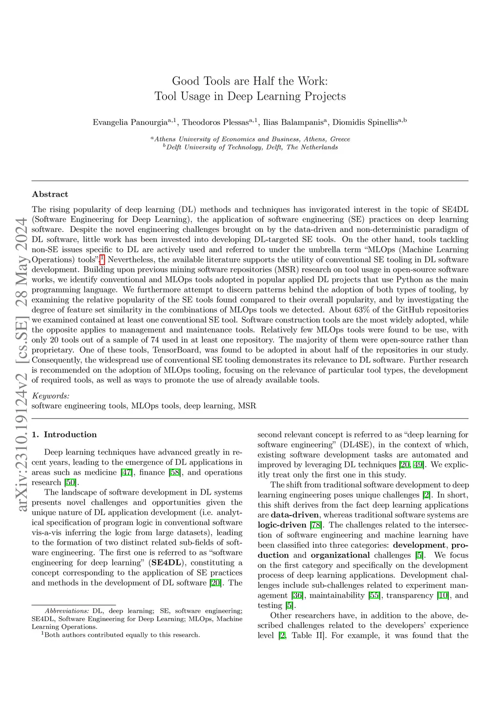 The rising popularity of deep learning (DL) methods and techniques has invigorated interest in the topic of SE4DL (Software Engineering for Deep Learning), the application of software engineering (SE) practices on deep learning software. Despite the novel engineering challenges brought on by the data-driven and non-deterministic paradigm of DL software, little work has been invested into developing DL-targeted SE tools. On the other hand, tools tackling non-SE issues specific to DL are actively used and referred to under the umbrella term "MLOps (Machine Learning Operations) tools". Nevertheless, the available literature supports the utility of conventional SE tooling in DL software development. Building upon previous mining software repositories (MSR) research on tool usage in open-source software works, we identify conventional and MLOps tools adopted in popular applied DL projects that use Python as the main programming language. About 63\% of the GitHub repositories we examined contained at least one conventional SE tool. Software construction tools are the most widely adopted, while the opposite applies to management and maintenance tools. Relatively few MLOps tools were found to be use, with only 20 tools out of a sample of 74 used in at least one repository. The majority of them were open-source rather than proprietary. One of these tools, TensorBoard, was found to be adopted in about half of the repositories in our study. Consequently, the widespread use of conventional SE tooling demonstrates its relevance to DL software. Further research is recommended on the adoption of MLOps tooling, focusing on the relevance of particular tool types, the development of required tools, as well as ways to promote the use of already available tools.
