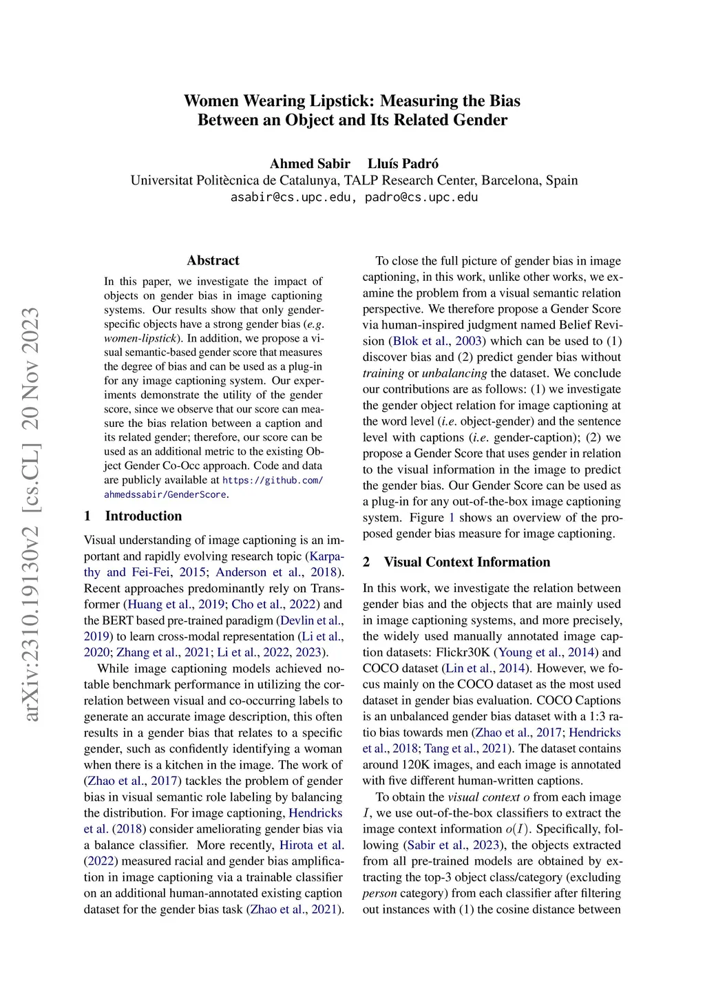 In this paper, we investigate the impact of objects on gender bias in image captioning systems. Our results show that only gender-specific objects have a strong gender bias (e.g., women-lipstick). In addition, we propose a visual semantic-based gender score that measures the degree of bias and can be used as a plug-in for any image captioning system. Our experiments demonstrate the utility of the gender score, since we observe that our score can measure the bias relation between a caption and its related gender; therefore, our score can be used as an additional metric to the existing Object Gender Co-Occ approach. Code and data are publicly available at \url{https://github.com/ahmedssabir/GenderScore}.