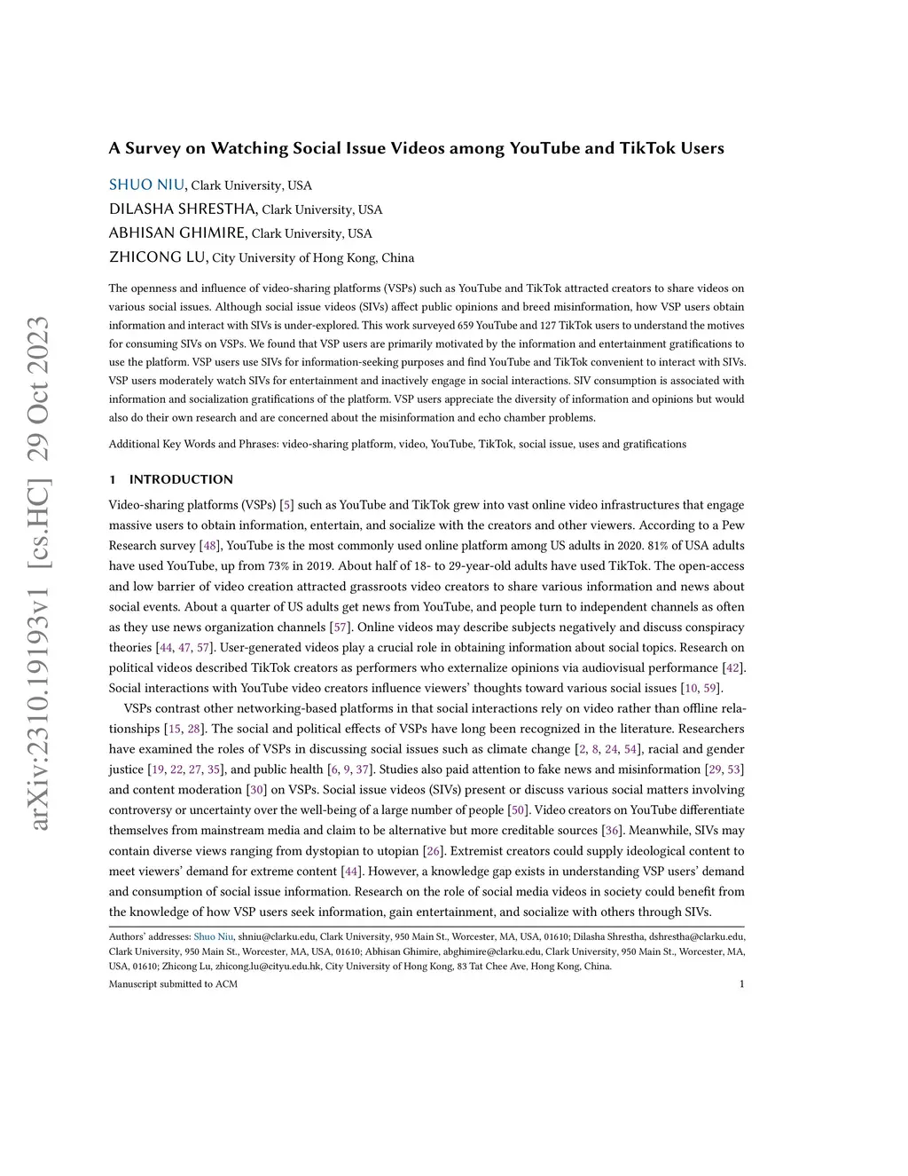 A Survey on Watching Social Issue Videos among YouTube and TikTok Users