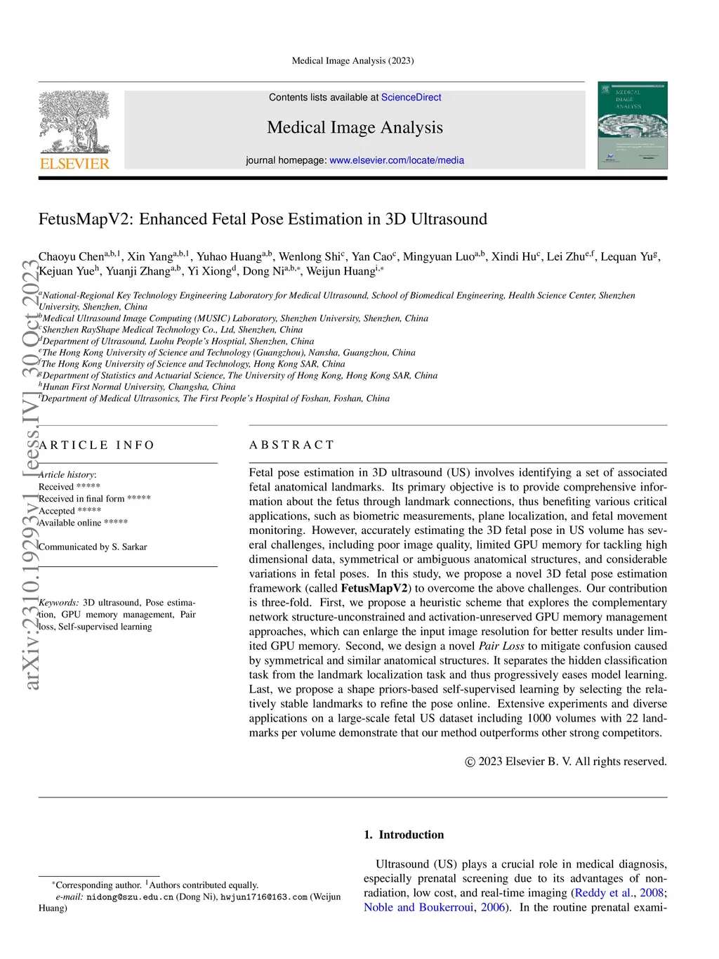 Fetal pose estimation in 3D ultrasound (US) involves identifying a set of associated fetal anatomical landmarks. Its primary objective is to provide comprehensive information about the fetus through landmark connections, thus benefiting various critical applications, such as biometric measurements, plane localization, and fetal movement monitoring. However, accurately estimating the 3D fetal pose in US volume has several challenges, including poor image quality, limited GPU memory for tackling high dimensional data, symmetrical or ambiguous anatomical structures, and considerable variations in fetal poses. In this study, we propose a novel 3D fetal pose estimation framework (called FetusMapV2) to overcome the above challenges. Our contribution is three-fold. First, we propose a heuristic scheme that explores the complementary network structure-unconstrained and activation-unreserved GPU memory management approaches, which can enlarge the input image resolution for better results under limited GPU memory. Second, we design a novel Pair Loss to mitigate confusion caused by symmetrical and similar anatomical structures. It separates the hidden classification task from the landmark localization task and thus progressively eases model learning. Last, we propose a shape priors-based self-supervised learning by selecting the relatively stable landmarks to refine the pose online. Extensive experiments and diverse applications on a large-scale fetal US dataset including 1000 volumes with 22 landmarks per volume demonstrate that our method outperforms other strong competitors.
