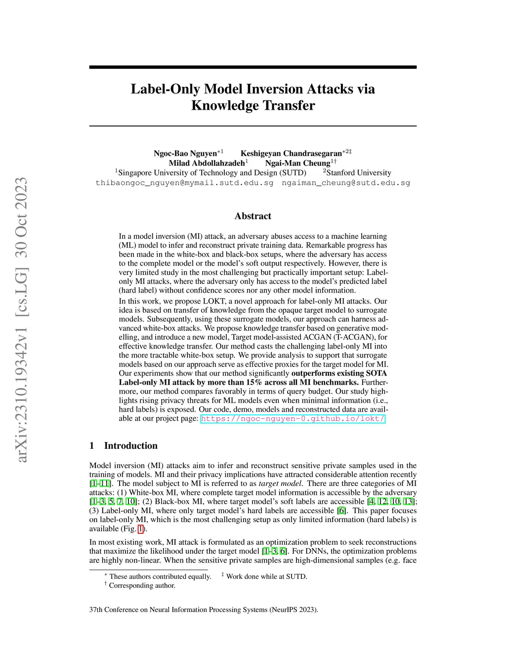 In a model inversion (MI) attack, an adversary abuses access to a machine learning (ML) model to infer and reconstruct private training data. Remarkable progress has been made in the white-box and black-box setups, where the adversary has access to the complete model or the model's soft output respectively. However, there is very limited study in the most challenging but practically important setup: Label-only MI attacks, where the adversary only has access to the model's predicted label (hard label) without confidence scores nor any other model information. In this work, we propose LOKT, a novel approach for label-only MI attacks. Our idea is based on transfer of knowledge from the opaque target model to surrogate models. Subsequently, using these surrogate models, our approach can harness advanced white-box attacks. We propose knowledge transfer based on generative modelling, and introduce a new model, Target model-assisted ACGAN (T-ACGAN), for effective knowledge transfer. Our method casts the challenging label-only MI into the more tractable white-box setup. We provide analysis to support that surrogate models based on our approach serve as effective proxies for the target model for MI. Our experiments show that our method significantly outperforms existing SOTA Label-only MI attack by more than 15% across all MI benchmarks. Furthermore, our method compares favorably in terms of query budget. Our study highlights rising privacy threats for ML models even when minimal information (i.e., hard labels) is exposed. Our study highlights rising privacy threats for ML models even when minimal information (i.e., hard labels) is exposed. Our code, demo, models and reconstructed data are available at our project page: https://ngoc-nguyen-0.github.io/lokt/