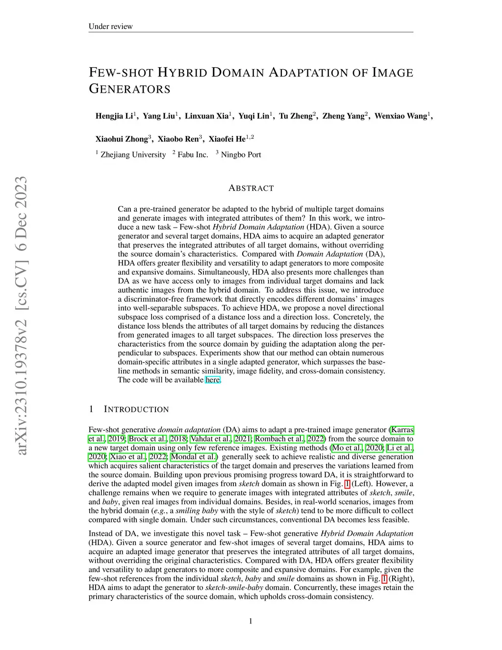 Can a pre-trained generator be adapted to the hybrid of multiple target domains and generate images with integrated attributes of them? In this work, we introduce a new task -- Few-shot Hybrid Domain Adaptation (HDA). Given a source generator and several target domains, HDA aims to acquire an adapted generator that preserves the integrated attributes of all target domains, without overriding the source domain's characteristics. Compared with Domain Adaptation (DA), HDA offers greater flexibility and versatility to adapt generators to more composite and expansive domains. Simultaneously, HDA also presents more challenges than DA as we have access only to images from individual target domains and lack authentic images from the hybrid domain. To address this issue, we introduce a discriminator-free framework that directly encodes different domains' images into well-separable subspaces. To achieve HDA, we propose a novel directional subspace loss comprised of a distance loss and a direction loss. Concretely, the distance loss blends the attributes of all target domains by reducing the distances from generated images to all target subspaces. The direction loss preserves the characteristics from the source domain by guiding the adaptation along the perpendicular to subspaces. Experiments show that our method can obtain numerous domain-specific attributes in a single adapted generator, which surpasses the baseline methods in semantic similarity, image fidelity, and cross-domain consistency.