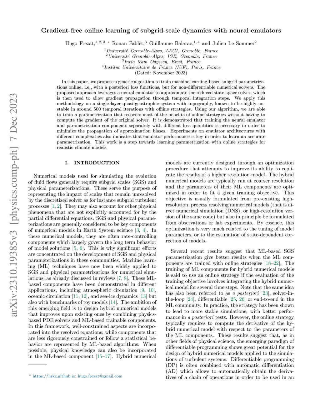 In this paper, we propose a generic algorithm to train machine learning-based subgrid parametrizations online, i.e., with \textit{a posteriori} loss functions, but for non-differentiable numerical solvers. The proposed approach leverages a neural emulator to approximate the reduced state-space solver, which is then used to allow gradient propagation through temporal integration steps. We apply this methodology on a chaotic two-timescales Lorenz-96 system and a single layer quasi-geostrophic system with zonal dynamics, known to be highly unstable with offline strategies. Using our algorithm, we are able to train a parametrization that recovers most of the benefits of online strategies without having to compute the gradient of the original solver. We found that training the neural emulator and parametrization components separately with different loss quantities is necessary in order to minimize the propagation of approximation biases. Experiments on emulator architectures with different complexities also indicates that emulator performance is key in order to learn an accurate parametrization. This work is a step towards learning parametrization with online strategies for climate models.