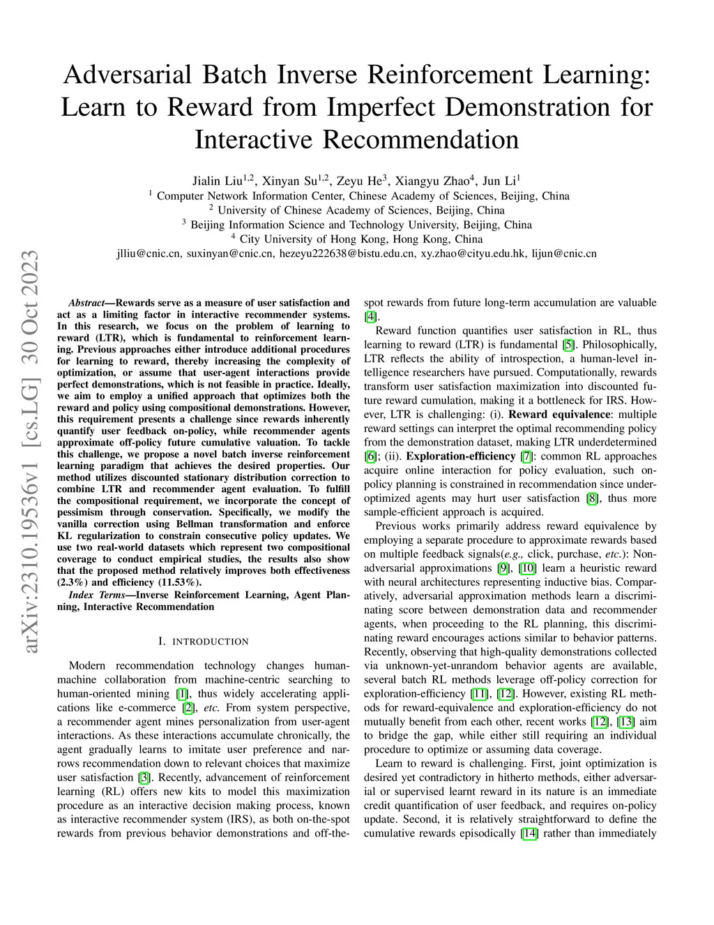 Rewards serve as a measure of user satisfaction and act as a limiting factor in interactive recommender systems. In this research, we focus on the problem of learning to reward (LTR), which is fundamental to reinforcement learning. Previous approaches either introduce additional procedures for learning to reward, thereby increasing the complexity of optimization, or assume that user-agent interactions provide perfect demonstrations, which is not feasible in practice. Ideally, we aim to employ a unified approach that optimizes both the reward and policy using compositional demonstrations. However, this requirement presents a challenge since rewards inherently quantify user feedback on-policy, while recommender agents approximate off-policy future cumulative valuation. To tackle this challenge, we propose a novel batch inverse reinforcement learning paradigm that achieves the desired properties. Our method utilizes discounted stationary distribution correction to combine LTR and recommender agent evaluation. To fulfill the compositional requirement, we incorporate the concept of pessimism through conservation. Specifically, we modify the vanilla correction using Bellman transformation and enforce KL regularization to constrain consecutive policy updates. We use two real-world datasets which represent two compositional coverage to conduct empirical studies, the results also show that the proposed method relatively improves both effectiveness (2.3\%) and efficiency (11.53\%)