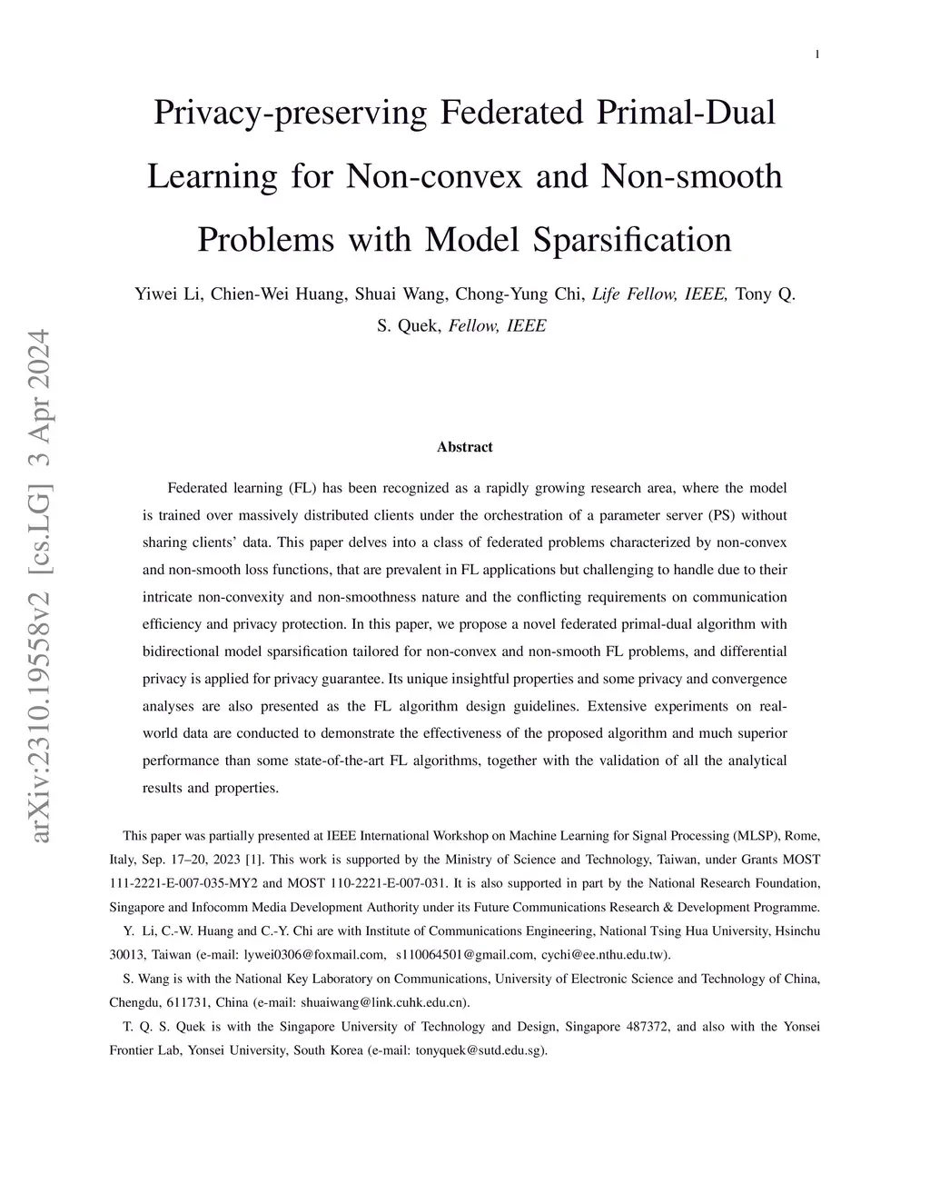 Federated learning (FL) has been recognized as a rapidly growing research area, where the model is trained over massively distributed clients under the orchestration of a parameter server (PS) without sharing clients' data. This paper delves into a class of federated problems characterized by non-convex and non-smooth loss functions, that are prevalent in FL applications but challenging to handle due to their intricate non-convexity and non-smoothness nature and the conflicting requirements on communication efficiency and privacy protection. In this paper, we propose a novel federated primal-dual algorithm with bidirectional model sparsification tailored for non-convex and non-smooth FL problems, and differential privacy is applied for privacy guarantee. Its unique insightful properties and some privacy and convergence analyses are also presented as the FL algorithm design guidelines. Extensive experiments on real-world data are conducted to demonstrate the effectiveness of the proposed algorithm and much superior performance than some state-of-the-art FL algorithms, together with the validation of all the analytical results and properties.