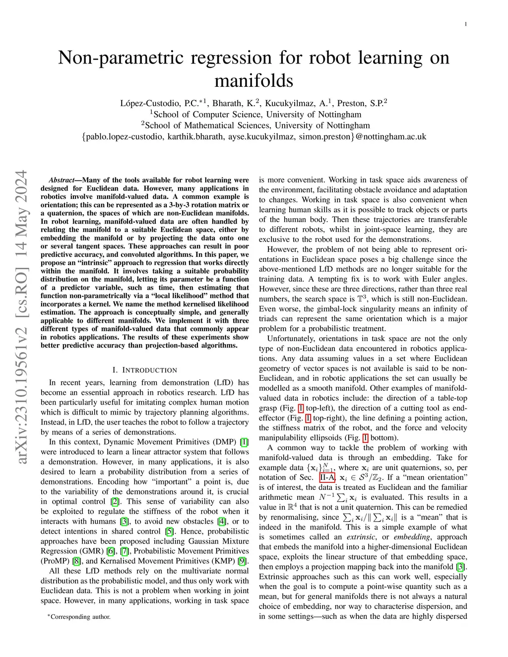 Non-parametric regression for robot learning on manifolds