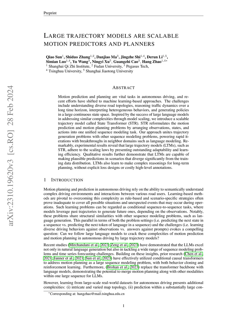 Motion prediction and planning are vital tasks in autonomous driving, and recent efforts have shifted to machine learning-based approaches. The challenges include understanding diverse road topologies, reasoning traffic dynamics over a long time horizon, interpreting heterogeneous behaviors, and generating policies in a large continuous state space. Inspired by the success of large language models in addressing similar complexities through model scaling, we introduce a scalable trajectory model called State Transformer (STR). STR reformulates the motion prediction and motion planning problems by arranging observations, states, and actions into one unified sequence modeling task. Our approach unites trajectory generation problems with other sequence modeling problems, powering rapid iterations with breakthroughs in neighbor domains such as language modeling. Remarkably, experimental results reveal that large trajectory models (LTMs), such as STR, adhere to the scaling laws by presenting outstanding adaptability and learning efficiency. Qualitative results further demonstrate that LTMs are capable of making plausible predictions in scenarios that diverge significantly from the training data distribution. LTMs also learn to make complex reasonings for long-term planning, without explicit loss designs or costly high-level annotations.