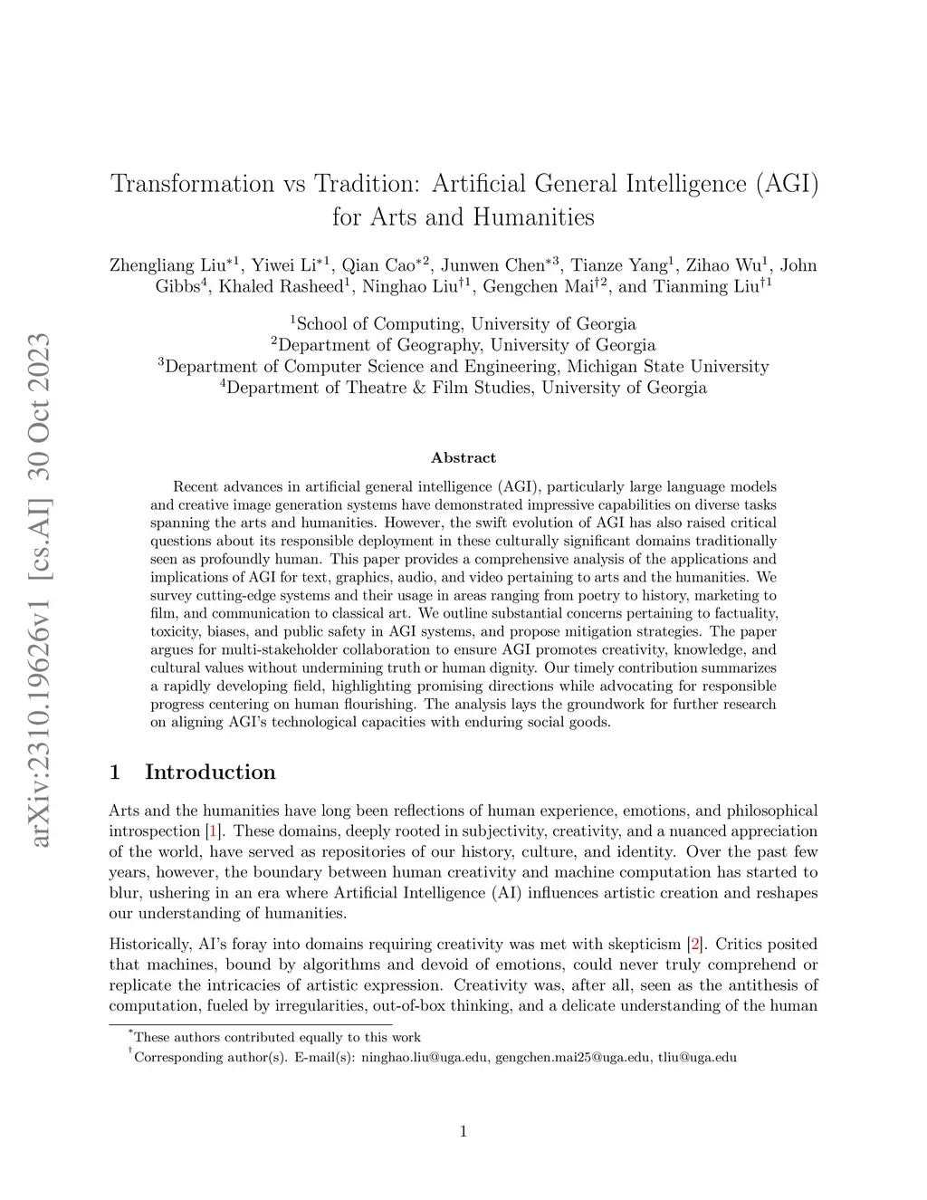 Recent advances in artificial general intelligence (AGI), particularly large language models and creative image generation systems have demonstrated impressive capabilities on diverse tasks spanning the arts and humanities. However, the swift evolution of AGI has also raised critical questions about its responsible deployment in these culturally significant domains traditionally seen as profoundly human. This paper provides a comprehensive analysis of the applications and implications of AGI for text, graphics, audio, and video pertaining to arts and the humanities. We survey cutting-edge systems and their usage in areas ranging from poetry to history, marketing to film, and communication to classical art. We outline substantial concerns pertaining to factuality, toxicity, biases, and public safety in AGI systems, and propose mitigation strategies. The paper argues for multi-stakeholder collaboration to ensure AGI promotes creativity, knowledge, and cultural values without undermining truth or human dignity. Our timely contribution summarizes a rapidly developing field, highlighting promising directions while advocating for responsible progress centering on human flourishing. The analysis lays the groundwork for further research on aligning AGI's technological capacities with enduring social goods.