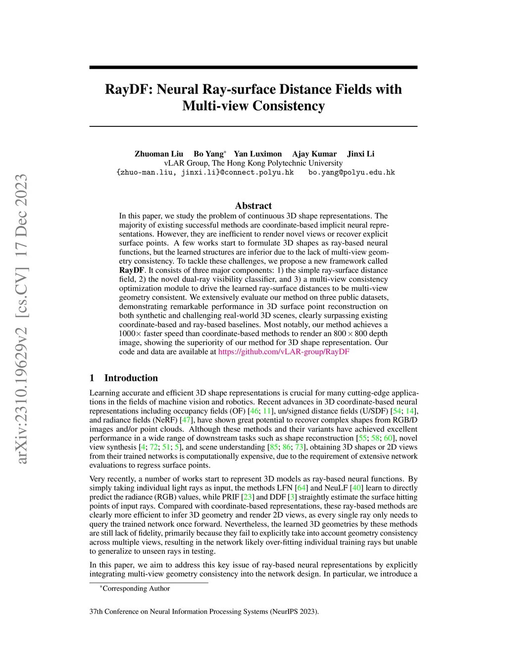 In this paper, we study the problem of continuous 3D shape representations. The majority of existing successful methods are coordinate-based implicit neural representations. However, they are inefficient to render novel views or recover explicit surface points. A few works start to formulate 3D shapes as ray-based neural functions, but the learned structures are inferior due to the lack of multi-view geometry consistency. To tackle these challenges, we propose a new framework called RayDF. It consists of three major components: 1) the simple ray-surface distance field, 2) the novel dual-ray visibility classifier, and 3) a multi-view consistency optimization module to drive the learned ray-surface distances to be multi-view geometry consistent. We extensively evaluate our method on three public datasets, demonstrating remarkable performance in 3D surface point reconstruction on both synthetic and challenging real-world 3D scenes, clearly surpassing existing coordinate-based and ray-based baselines. Most notably, our method achieves a 1000x faster speed than coordinate-based methods to render an 800x800 depth image, showing the superiority of our method for 3D shape representation. Our code and data are available at https://github.com/vLAR-group/RayDF