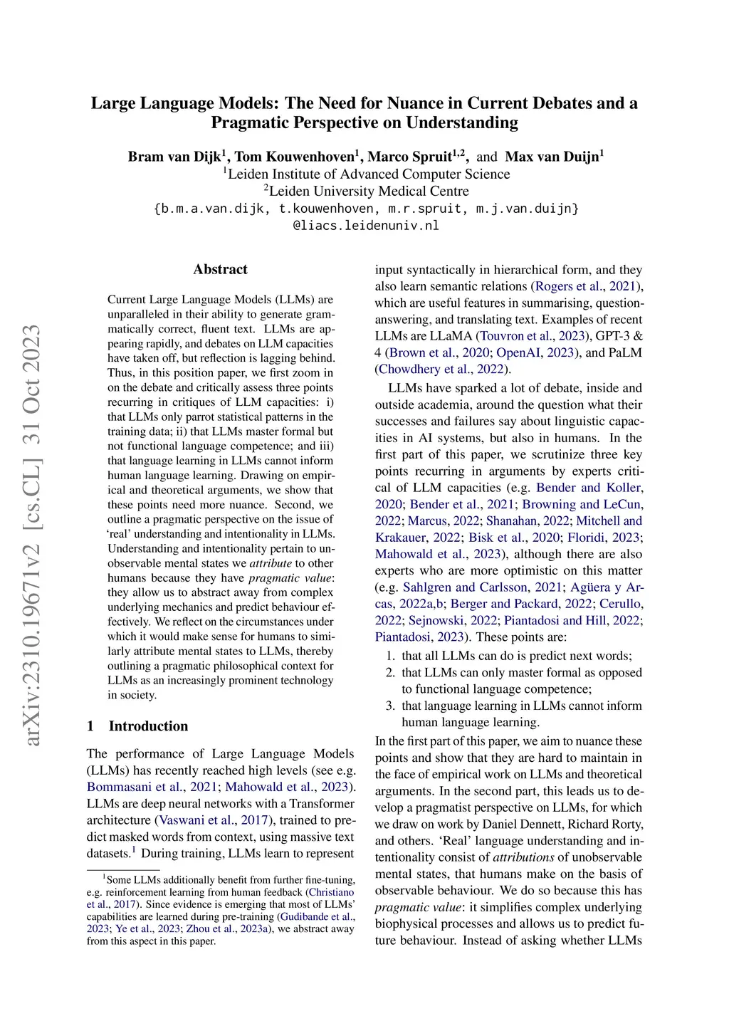 Current Large Language Models (LLMs) are unparalleled in their ability to generate grammatically correct, fluent text. LLMs are appearing rapidly, and debates on LLM capacities have taken off, but reflection is lagging behind. Thus, in this position paper, we first zoom in on the debate and critically assess three points recurring in critiques of LLM capacities: i) that LLMs only parrot statistical patterns in the training data; ii) that LLMs master formal but not functional language competence; and iii) that language learning in LLMs cannot inform human language learning. Drawing on empirical and theoretical arguments, we show that these points need more nuance. Second, we outline a pragmatic perspective on the issue of `real' understanding and intentionality in LLMs. Understanding and intentionality pertain to unobservable mental states we attribute to other humans because they have pragmatic value: they allow us to abstract away from complex underlying mechanics and predict behaviour effectively. We reflect on the circumstances under which it would make sense for humans to similarly attribute mental states to LLMs, thereby outlining a pragmatic philosophical context for LLMs as an increasingly prominent technology in society.