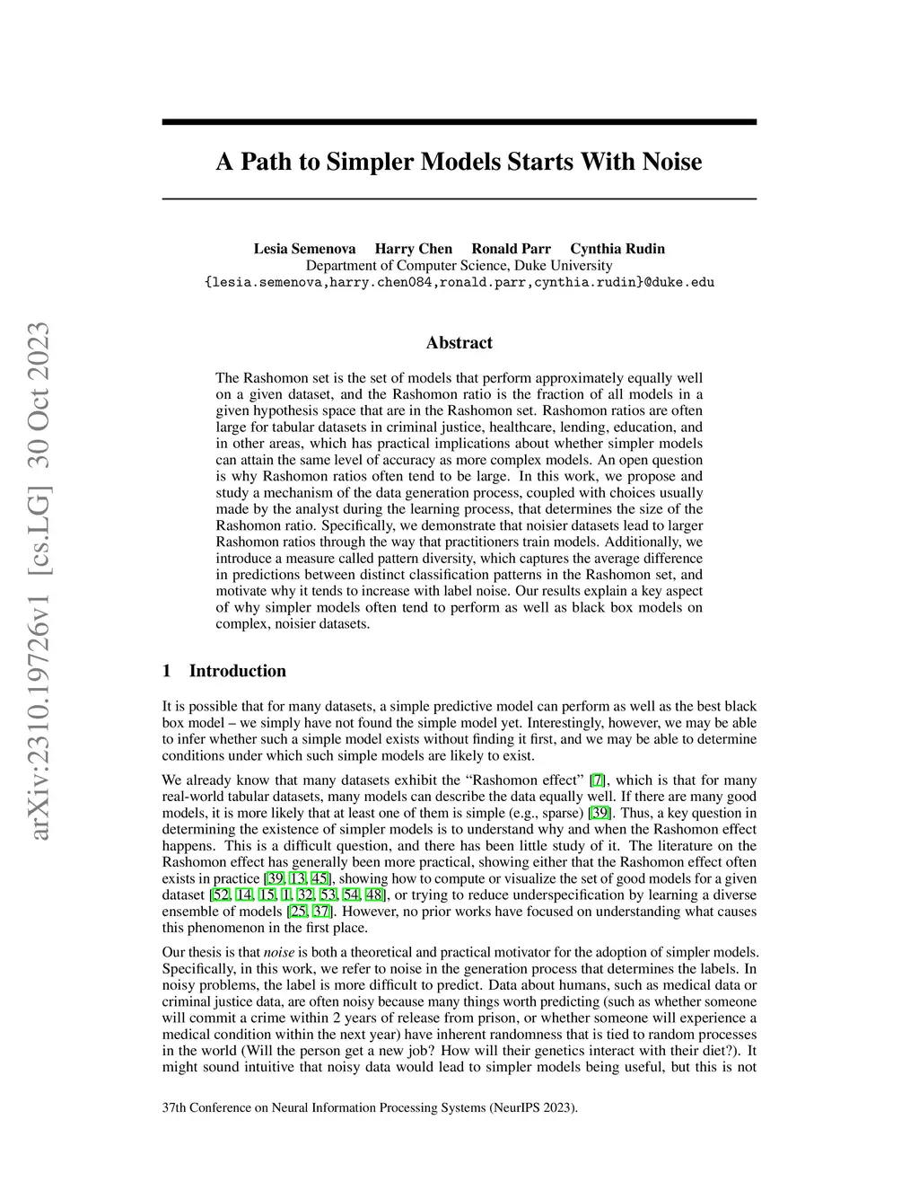 The Rashomon set is the set of models that perform approximately equally well on a given dataset, and the Rashomon ratio is the fraction of all models in a given hypothesis space that are in the Rashomon set. Rashomon ratios are often large for tabular datasets in criminal justice, healthcare, lending, education, and in other areas, which has practical implications about whether simpler models can attain the same level of accuracy as more complex models. An open question is why Rashomon ratios often tend to be large. In this work, we propose and study a mechanism of the data generation process, coupled with choices usually made by the analyst during the learning process, that determines the size of the Rashomon ratio. Specifically, we demonstrate that noisier datasets lead to larger Rashomon ratios through the way that practitioners train models. Additionally, we introduce a measure called pattern diversity, which captures the average difference in predictions between distinct classification patterns in the Rashomon set, and motivate why it tends to increase with label noise. Our results explain a key aspect of why simpler models often tend to perform as well as black box models on complex, noisier datasets.