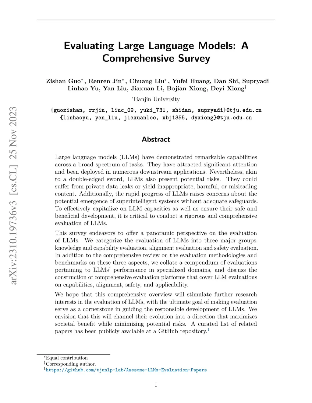Large language models (LLMs) have demonstrated remarkable capabilities across a broad spectrum of tasks. They have attracted significant attention and been deployed in numerous downstream applications. Nevertheless, akin to a double-edged sword, LLMs also present potential risks. They could suffer from private data leaks or yield inappropriate, harmful, or misleading content. Additionally, the rapid progress of LLMs raises concerns about the potential emergence of superintelligent systems without adequate safeguards. To effectively capitalize on LLM capacities as well as ensure their safe and beneficial development, it is critical to conduct a rigorous and comprehensive evaluation of LLMs. This survey endeavors to offer a panoramic perspective on the evaluation of LLMs. We categorize the evaluation of LLMs into three major groups: knowledge and capability evaluation, alignment evaluation and safety evaluation. In addition to the comprehensive review on the evaluation methodologies and benchmarks on these three aspects, we collate a compendium of evaluations pertaining to LLMs' performance in specialized domains, and discuss the construction of comprehensive evaluation platforms that cover LLM evaluations on capabilities, alignment, safety, and applicability. We hope that this comprehensive overview will stimulate further research interests in the evaluation of LLMs, with the ultimate goal of making evaluation serve as a cornerstone in guiding the responsible development of LLMs. We envision that this will channel their evolution into a direction that maximizes societal benefit while minimizing potential risks. A curated list of related papers has been publicly available at https://github.com/tjunlp-lab/Awesome-LLMs-Evaluation-Papers.