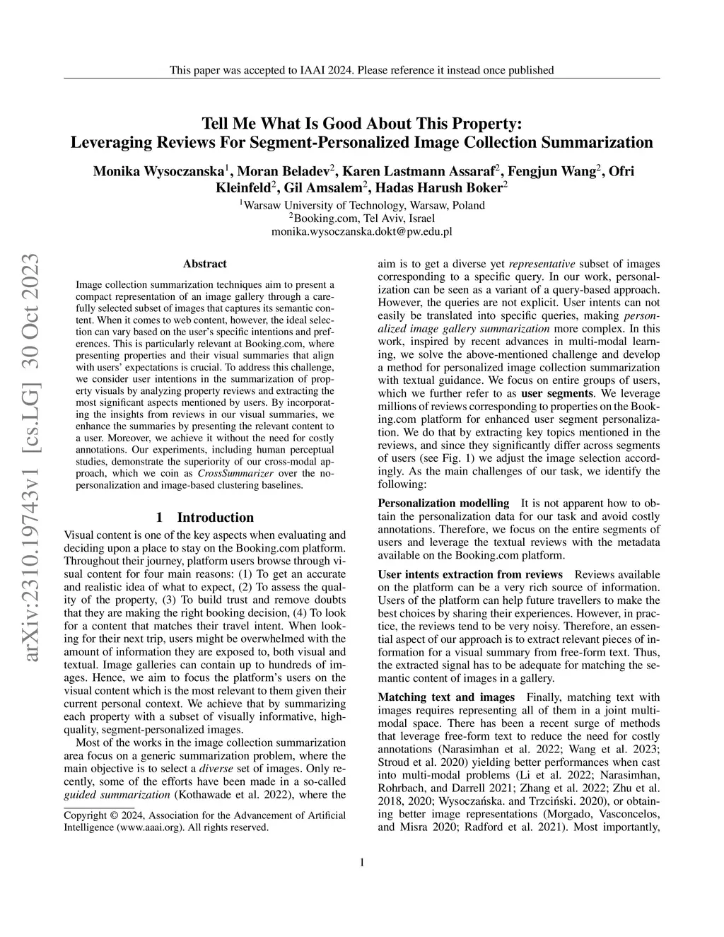 Image collection summarization techniques aim to present a compact representation of an image gallery through a carefully selected subset of images that captures its semantic content. When it comes to web content, however, the ideal selection can vary based on the user's specific intentions and preferences. This is particularly relevant at Booking.com, where presenting properties and their visual summaries that align with users' expectations is crucial. To address this challenge, we consider user intentions in the summarization of property visuals by analyzing property reviews and extracting the most significant aspects mentioned by users. By incorporating the insights from reviews in our visual summaries, we enhance the summaries by presenting the relevant content to a user. Moreover, we achieve it without the need for costly annotations. Our experiments, including human perceptual studies, demonstrate the superiority of our cross-modal approach, which we coin as CrossSummarizer over the no-personalization and image-based clustering baselines.
