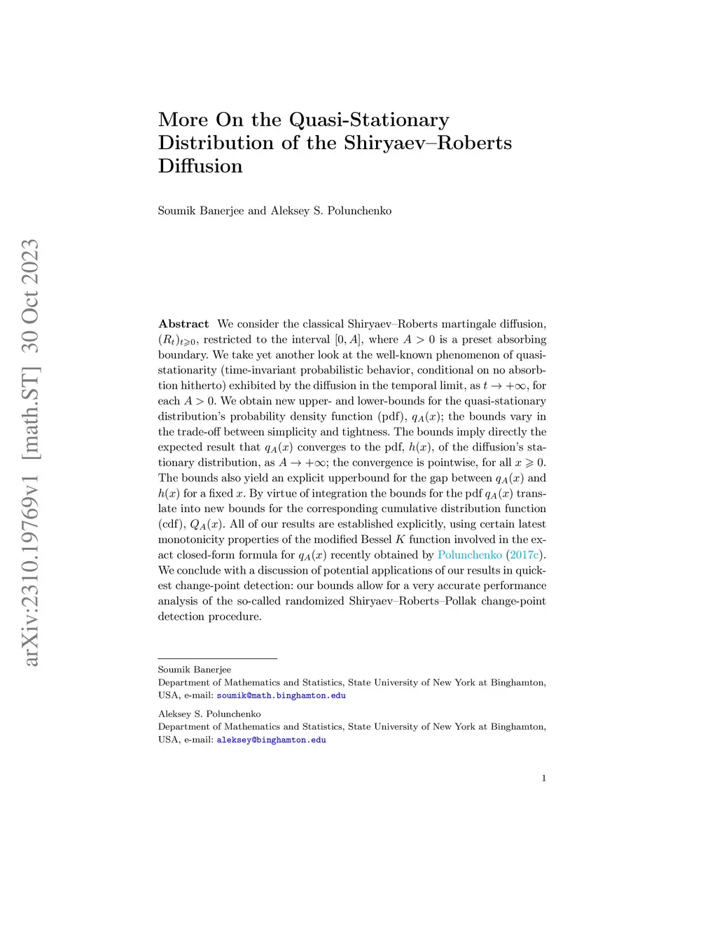 More On the Quasi-Stationary Distribution of the Shiryaev--Roberts