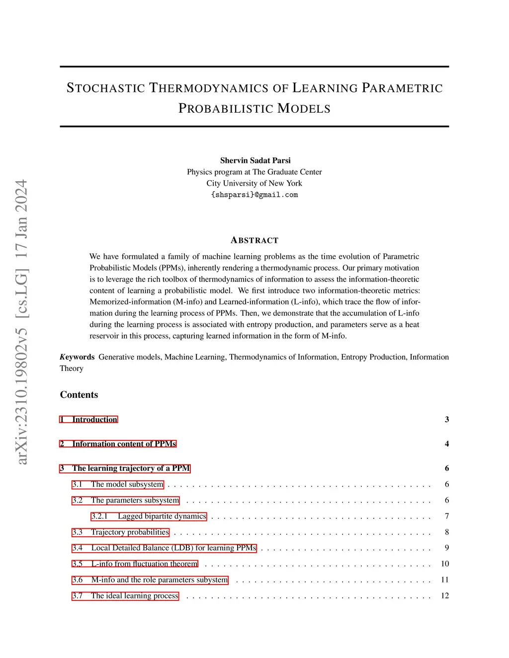 We have formulated a family of machine learning problems as the time evolution of Parametric Probabilistic Models (PPMs), inherently rendering a thermodynamic process. Our primary motivation is to leverage the rich toolbox of thermodynamics of information to assess the information-theoretic content of learning a probabilistic model. We first introduce two information-theoretic metrics: Memorized-information (M-info) and Learned-information (L-info), which trace the flow of information during the learning process of PPMs. Then, we demonstrate that the accumulation of L-info during the learning process is associated with entropy production, and parameters serve as a heat reservoir in this process, capturing learned information in the form of M-info.