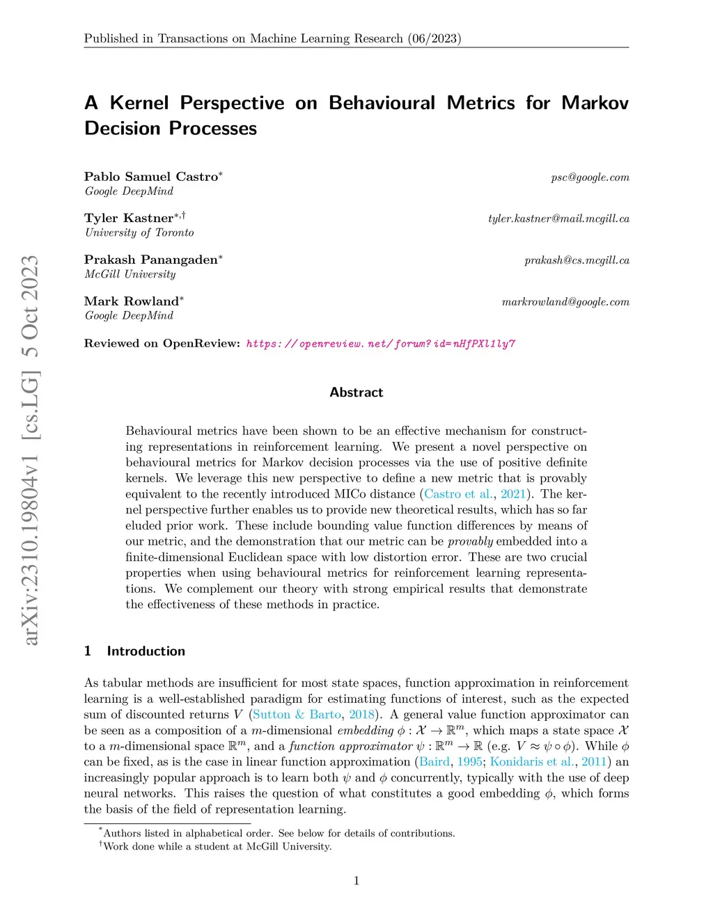 Behavioural metrics have been shown to be an effective mechanism for constructing representations in reinforcement learning. We present a novel perspective on behavioural metrics for Markov decision processes via the use of positive definite kernels. We leverage this new perspective to define a new metric that is provably equivalent to the recently introduced MICo distance (Castro et al., 2021). The kernel perspective further enables us to provide new theoretical results, which has so far eluded prior work. These include bounding value function differences by means of our metric, and the demonstration that our metric can be provably embedded into a finite-dimensional Euclidean space with low distortion error. These are two crucial properties when using behavioural metrics for reinforcement learning representations. We complement our theory with strong empirical results that demonstrate the effectiveness of these methods in practice.