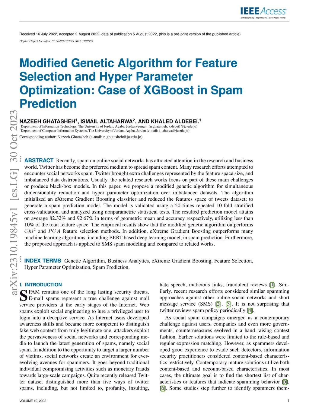 Recently, spam on online social networks has attracted attention in the research and business world. Twitter has become the preferred medium to spread spam content. Many research efforts attempted to encounter social networks spam. Twitter brought extra challenges represented by the feature space size, and imbalanced data distributions. Usually, the related research works focus on part of these main challenges or produce black-box models. In this paper, we propose a modified genetic algorithm for simultaneous dimensionality reduction and hyper parameter optimization over imbalanced datasets. The algorithm initialized an eXtreme Gradient Boosting classifier and reduced the features space of tweets dataset; to generate a spam prediction model. The model is validated using a 50 times repeated 10-fold stratified cross-validation, and analyzed using nonparametric statistical tests. The resulted prediction model attains on average 82.32\% and 92.67\% in terms of geometric mean and accuracy respectively, utilizing less than 10\% of the total feature space. The empirical results show that the modified genetic algorithm outperforms and feature selection methods. In addition, eXtreme Gradient Boosting outperforms many machine learning algorithms, including BERT-based deep learning model, in spam prediction. Furthermore, the proposed approach is applied to SMS spam modeling and compared to related works.