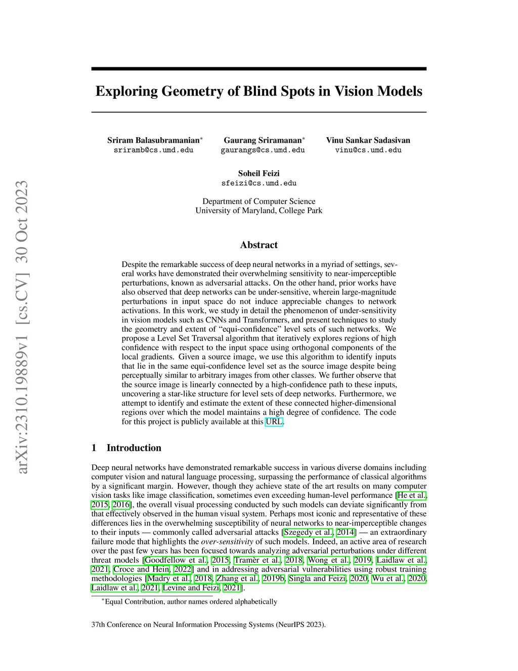 Despite the remarkable success of deep neural networks in a myriad of settings, several works have demonstrated their overwhelming sensitivity to near-imperceptible perturbations, known as adversarial attacks. On the other hand, prior works have also observed that deep networks can be under-sensitive, wherein large-magnitude perturbations in input space do not induce appreciable changes to network activations. In this work, we study in detail the phenomenon of under-sensitivity in vision models such as CNNs and Transformers, and present techniques to study the geometry and extent of "equi-confidence" level sets of such networks. We propose a Level Set Traversal algorithm that iteratively explores regions of high confidence with respect to the input space using orthogonal components of the local gradients. Given a source image, we use this algorithm to identify inputs that lie in the same equi-confidence level set as the source image despite being perceptually similar to arbitrary images from other classes. We further observe that the source image is linearly connected by a high-confidence path to these inputs, uncovering a star-like structure for level sets of deep networks. Furthermore, we attempt to identify and estimate the extent of these connected higher-dimensional regions over which the model maintains a high degree of confidence. The code for this project is publicly available at https://github.com/SriramB-98/blindspots-neurips-sub