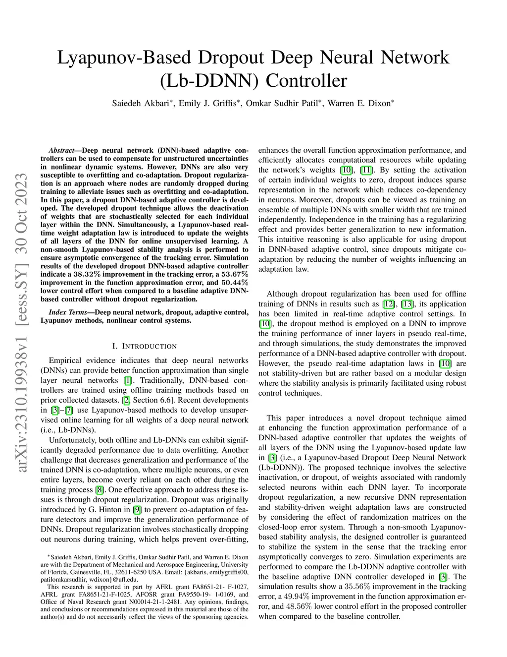 Lyapunov-Based Dropout Deep Neural Network (Lb-DDNN) Controller