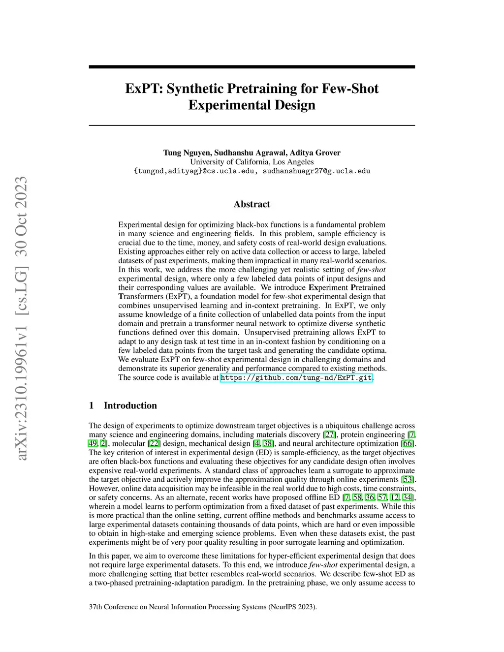 ExPT: Synthetic Pretraining for Few-Shot Experimental Design
