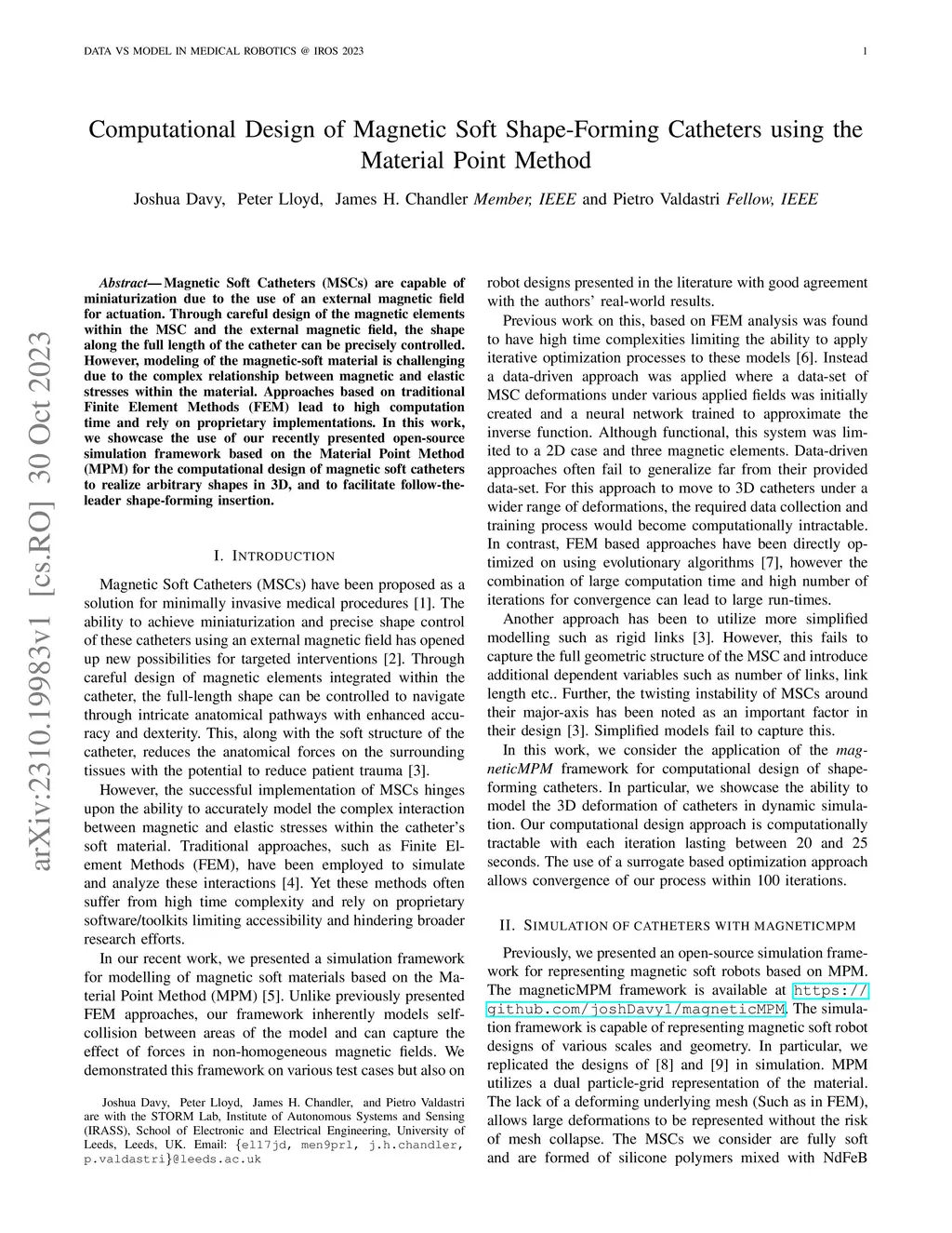 Magnetic Soft Catheters (MSCs) are capable of miniaturization due to the use of an external magnetic field for actuation. Through careful design of the magnetic elements within the MSC and the external magnetic field, the shape along the full length of the catheter can be precisely controlled. However, modeling of the magnetic-soft material is challenging due to the complex relationship between magnetic and elastic stresses within the material. Approaches based on traditional Finite Element Methods (FEM) lead to high computation time and rely on proprietary implementations. In this work, we showcase the use of our recently presented open-source simulation framework based on the Material Point Method (MPM) for the computational design of magnetic soft catheters to realize arbitrary shapes in 3D, and to facilitate follow-the-leader shape-forming insertion.