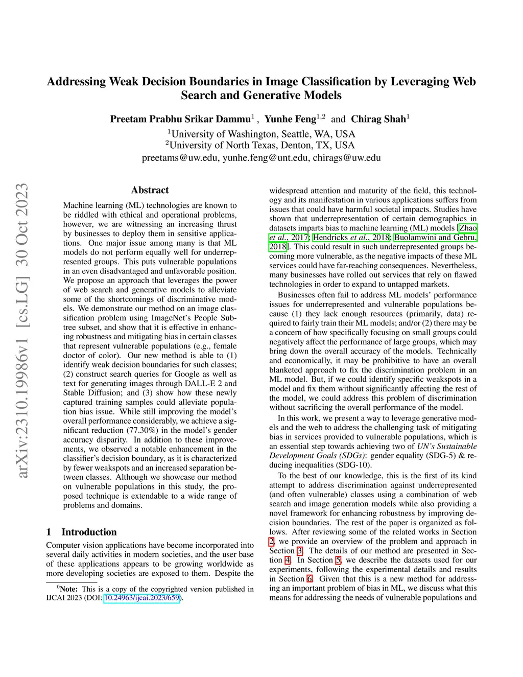 Machine learning (ML) technologies are known to be riddled with ethical and operational problems, however, we are witnessing an increasing thrust by businesses to deploy them in sensitive applications. One major issue among many is that ML models do not perform equally well for underrepresented groups. This puts vulnerable populations in an even disadvantaged and unfavorable position. We propose an approach that leverages the power of web search and generative models to alleviate some of the shortcomings of discriminative models. We demonstrate our method on an image classification problem using ImageNet's People Subtree subset, and show that it is effective in enhancing robustness and mitigating bias in certain classes that represent vulnerable populations (e.g., female doctor of color). Our new method is able to (1) identify weak decision boundaries for such classes; (2) construct search queries for Google as well as text for generating images through DALL-E 2 and Stable Diffusion; and (3) show how these newly captured training samples could alleviate population bias issue. While still improving the model's overall performance considerably, we achieve a significant reduction (77.30\%) in the model's gender accuracy disparity. In addition to these improvements, we observed a notable enhancement in the classifier's decision boundary, as it is characterized by fewer weakspots and an increased separation between classes. Although we showcase our method on vulnerable populations in this study, the proposed technique is extendable to a wide range of problems and domains.