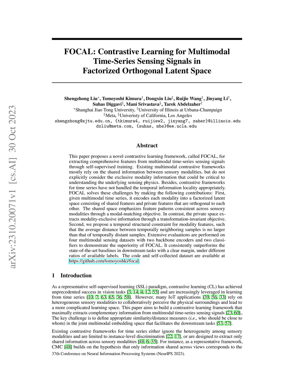 This paper proposes a novel contrastive learning framework, called FOCAL, for extracting comprehensive features from multimodal time-series sensing signals through self-supervised training. Existing multimodal contrastive frameworks mostly rely on the shared information between sensory modalities, but do not explicitly consider the exclusive modality information that could be critical to understanding the underlying sensing physics. Besides, contrastive frameworks for time series have not handled the temporal information locality appropriately. FOCAL solves these challenges by making the following contributions: First, given multimodal time series, it encodes each modality into a factorized latent space consisting of shared features and private features that are orthogonal to each other. The shared space emphasizes feature patterns consistent across sensory modalities through a modal-matching objective. In contrast, the private space extracts modality-exclusive information through a transformation-invariant objective. Second, we propose a temporal structural constraint for modality features, such that the average distance between temporally neighboring samples is no larger than that of temporally distant samples. Extensive evaluations are performed on four multimodal sensing datasets with two backbone encoders and two classifiers to demonstrate the superiority of FOCAL. It consistently outperforms the state-of-the-art baselines in downstream tasks with a clear margin, under different ratios of available labels. The code and self-collected dataset are available at https://github.com/tomoyoshki/focal.