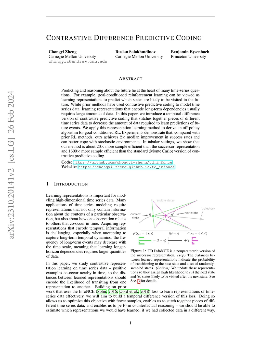 Predicting and reasoning about the future lie at the heart of many time-series questions. For example, goal-conditioned reinforcement learning can be viewed as learning representations to predict which states are likely to be visited in the future. While prior methods have used contrastive predictive coding to model time series data, learning representations that encode long-term dependencies usually requires large amounts of data. In this paper, we introduce a temporal difference version of contrastive predictive coding that stitches together pieces of different time series data to decrease the amount of data required to learn predictions of future events. We apply this representation learning method to derive an off-policy algorithm for goal-conditioned RL. Experiments demonstrate that, compared with prior RL methods, ours achieves median improvement in success rates and can better cope with stochastic environments. In tabular settings, we show that our method is about more sample efficient than the successor representation and more sample efficient than the standard (Monte Carlo) version of contrastive predictive coding.