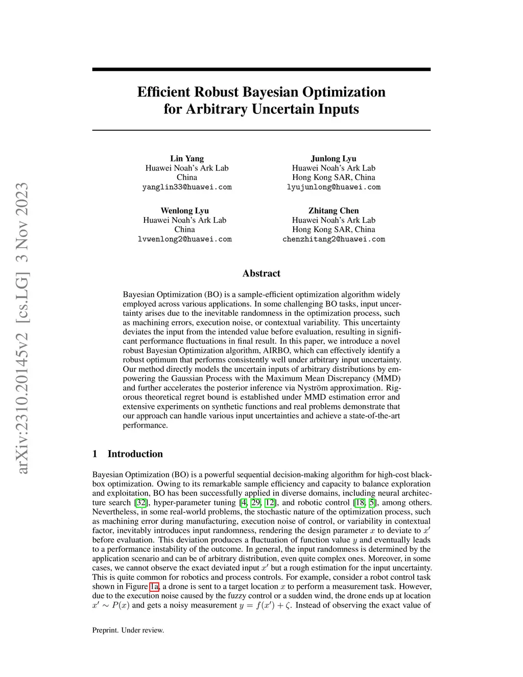 Bayesian Optimization (BO) is a sample-efficient optimization algorithm widely employed across various applications. In some challenging BO tasks, input uncertainty arises due to the inevitable randomness in the optimization process, such as machining errors, execution noise, or contextual variability. This uncertainty deviates the input from the intended value before evaluation, resulting in significant performance fluctuations in the final result. In this paper, we introduce a novel robust Bayesian Optimization algorithm, AIRBO, which can effectively identify a robust optimum that performs consistently well under arbitrary input uncertainty. Our method directly models the uncertain inputs of arbitrary distributions by empowering the Gaussian Process with the Maximum Mean Discrepancy (MMD) and further accelerates the posterior inference via Nystrom approximation. Rigorous theoretical regret bound is established under MMD estimation error and extensive experiments on synthetic functions and real problems demonstrate that our approach can handle various input uncertainties and achieve state-of-the-art performance.