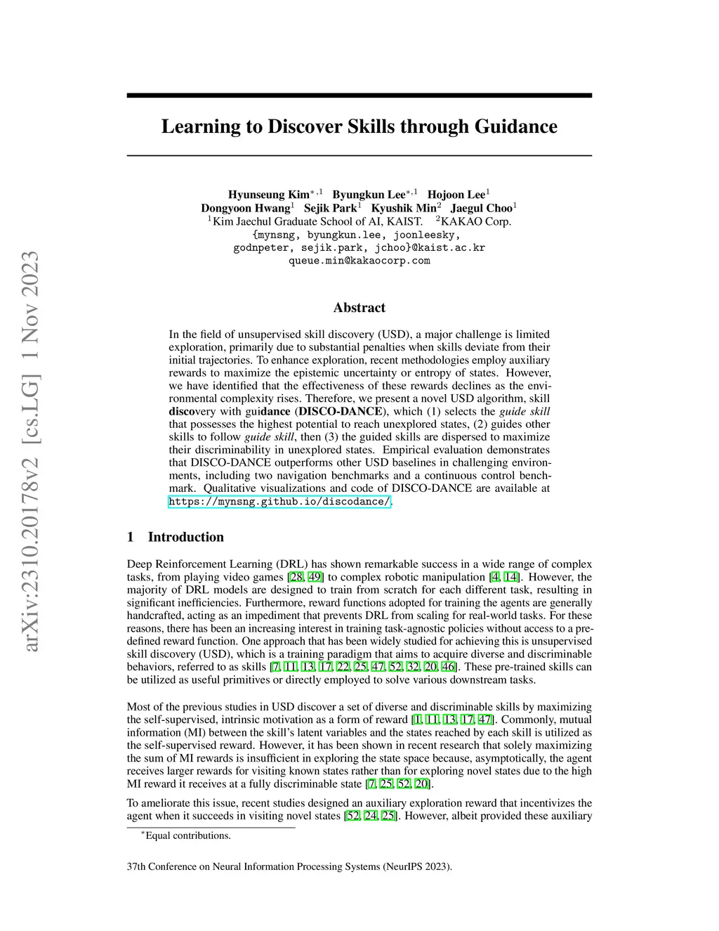 In the field of unsupervised skill discovery (USD), a major challenge is limited exploration, primarily due to substantial penalties when skills deviate from their initial trajectories. To enhance exploration, recent methodologies employ auxiliary rewards to maximize the epistemic uncertainty or entropy of states. However, we have identified that the effectiveness of these rewards declines as the environmental complexity rises. Therefore, we present a novel USD algorithm, skill discovery with guidance (DISCO-DANCE), which (1) selects the guide skill that possesses the highest potential to reach unexplored states, (2) guides other skills to follow guide skill, then (3) the guided skills are dispersed to maximize their discriminability in unexplored states. Empirical evaluation demonstrates that DISCO-DANCE outperforms other USD baselines in challenging environments, including two navigation benchmarks and a continuous control benchmark. Qualitative visualizations and code of DISCO-DANCE are available at https://mynsng.github.io/discodance.