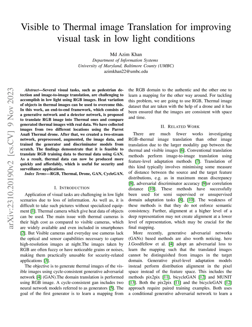 Several visual tasks, such as pedestrian detection and image-to-image translation, are challenging to accomplish in low light using RGB images. Heat variation of objects in thermal images can be used to overcome this. In this work, an end-to-end framework, which consists of a generative network and a detector network, is proposed to translate RGB image into Thermal ones and compare generated thermal images with real data. We have collected images from two different locations using the Parrot Anafi Thermal drone. After that, we created a two-stream network, preprocessed, augmented, the image data, and trained the generator and discriminator models from scratch. The findings demonstrate that it is feasible to translate RGB training data to thermal data using GAN. As a result, thermal data can now be produced more quickly and affordably, which is useful for security and surveillance applications.