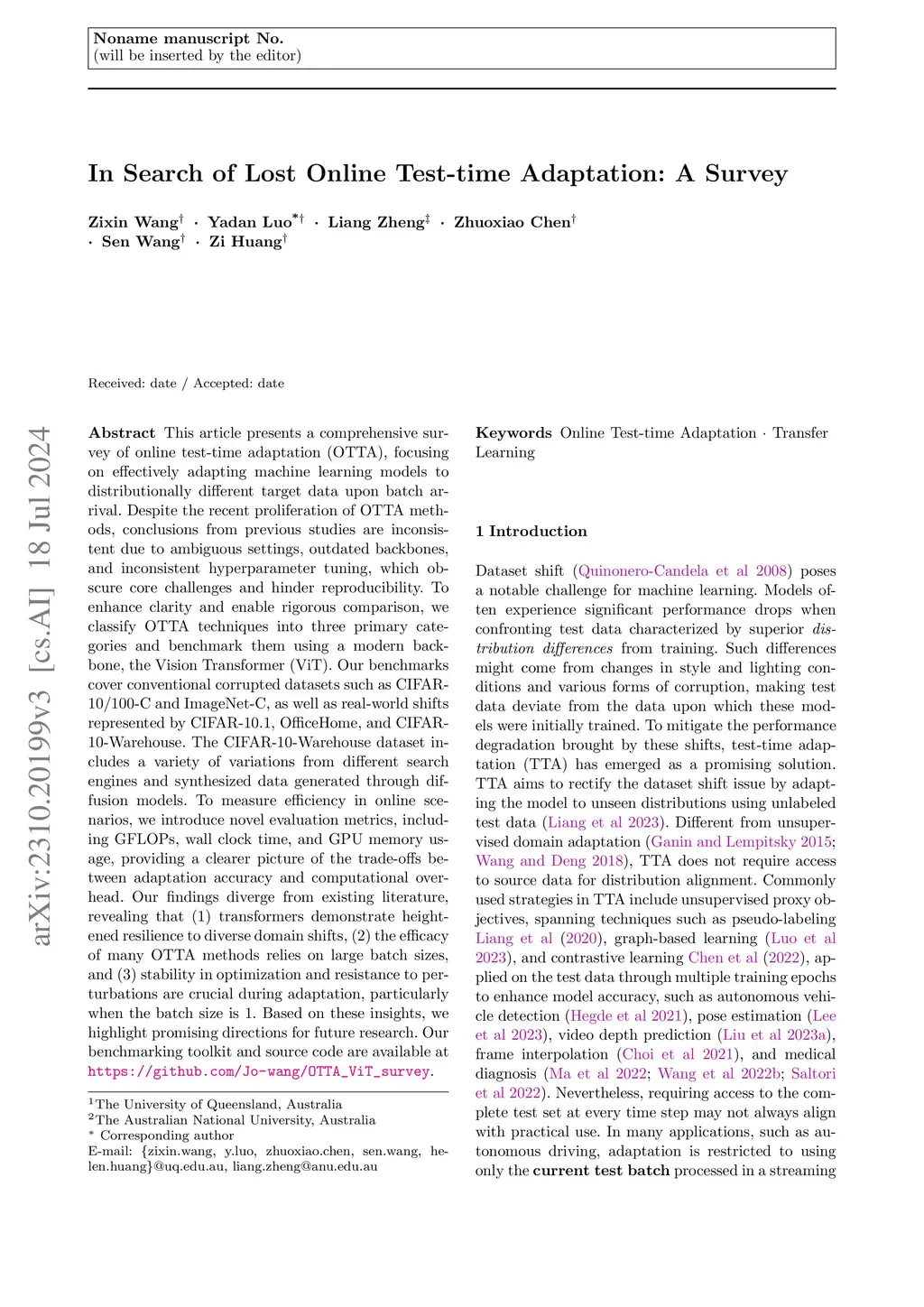 This article presents a comprehensive survey of online test-time adaptation (OTTA), focusing on effectively adapting machine learning models to distributionally different target data upon batch arrival. Despite the recent proliferation of OTTA methods, conclusions from previous studies are inconsistent due to ambiguous settings, outdated backbones, and inconsistent hyperparameter tuning, which obscure core challenges and hinder reproducibility. To enhance clarity and enable rigorous comparison, we classify OTTA techniques into three primary categories and benchmark them using a modern backbone, the Vision Transformer (ViT). Our benchmarks cover conventional corrupted datasets such as CIFAR-10/100-C and ImageNet-C, as well as real-world shifts represented by CIFAR-10.1, OfficeHome, and CIFAR-10-Warehouse. The CIFAR-10-Warehouse dataset includes a variety of variations from different search engines and synthesized data generated through diffusion models. To measure efficiency in online scenarios, we introduce novel evaluation metrics, including GFLOPs, wall clock time, and GPU memory usage, providing a clearer picture of the trade-offs between adaptation accuracy and computational overhead. Our findings diverge from existing literature, revealing that (1) transformers demonstrate heightened resilience to diverse domain shifts, (2) the efficacy of many OTTA methods relies on large batch sizes, and (3) stability in optimization and resistance to perturbations are crucial during adaptation, particularly when the batch size is 1. Based on these insights, we highlight promising directions for future research. Our benchmarking toolkit and source code are available at https://github.com/Jo-wang/OTTA_ViT_survey.