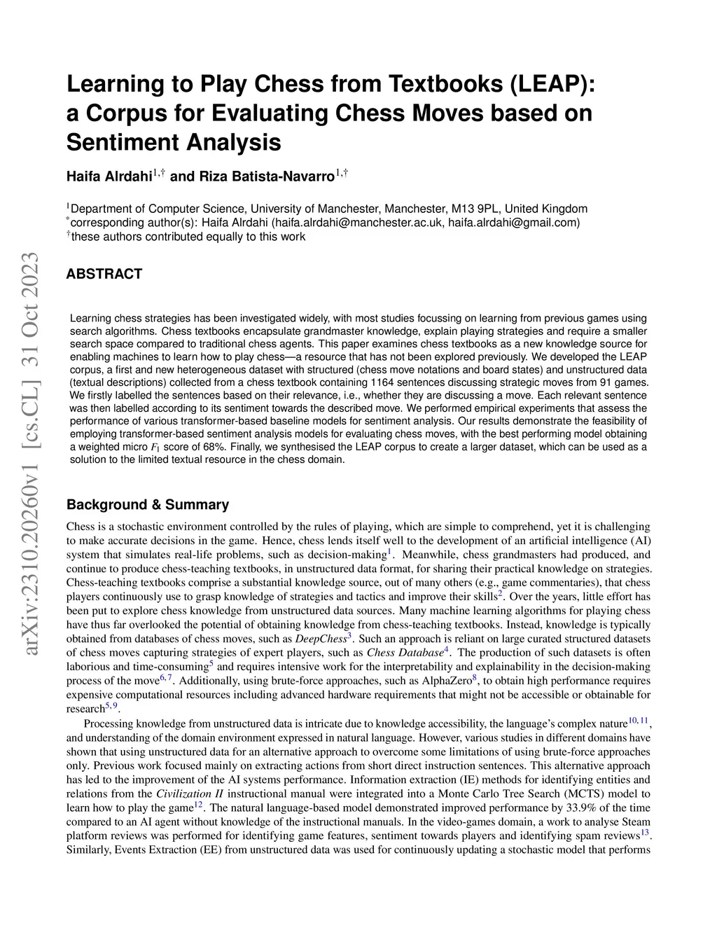 Learning chess strategies has been investigated widely, with most studies focussing on learning from previous games using search algorithms. Chess textbooks encapsulate grandmaster knowledge, explain playing strategies and require a smaller search space compared to traditional chess agents. This paper examines chess textbooks as a new knowledge source for enabling machines to learn how to play chess -- a resource that has not been explored previously. We developed the LEAP corpus, a first and new heterogeneous dataset with structured (chess move notations and board states) and unstructured data (textual descriptions) collected from a chess textbook containing 1164 sentences discussing strategic moves from 91 games. We firstly labelled the sentences based on their relevance, i.e., whether they are discussing a move. Each relevant sentence was then labelled according to its sentiment towards the described move. We performed empirical experiments that assess the performance of various transformer-based baseline models for sentiment analysis. Our results demonstrate the feasibility of employing transformer-based sentiment analysis models for evaluating chess moves, with the best performing model obtaining a weighted micro F_1 score of 68%. Finally, we synthesised the LEAP corpus to create a larger dataset, which can be used as a solution to the limited textual resource in the chess domain.