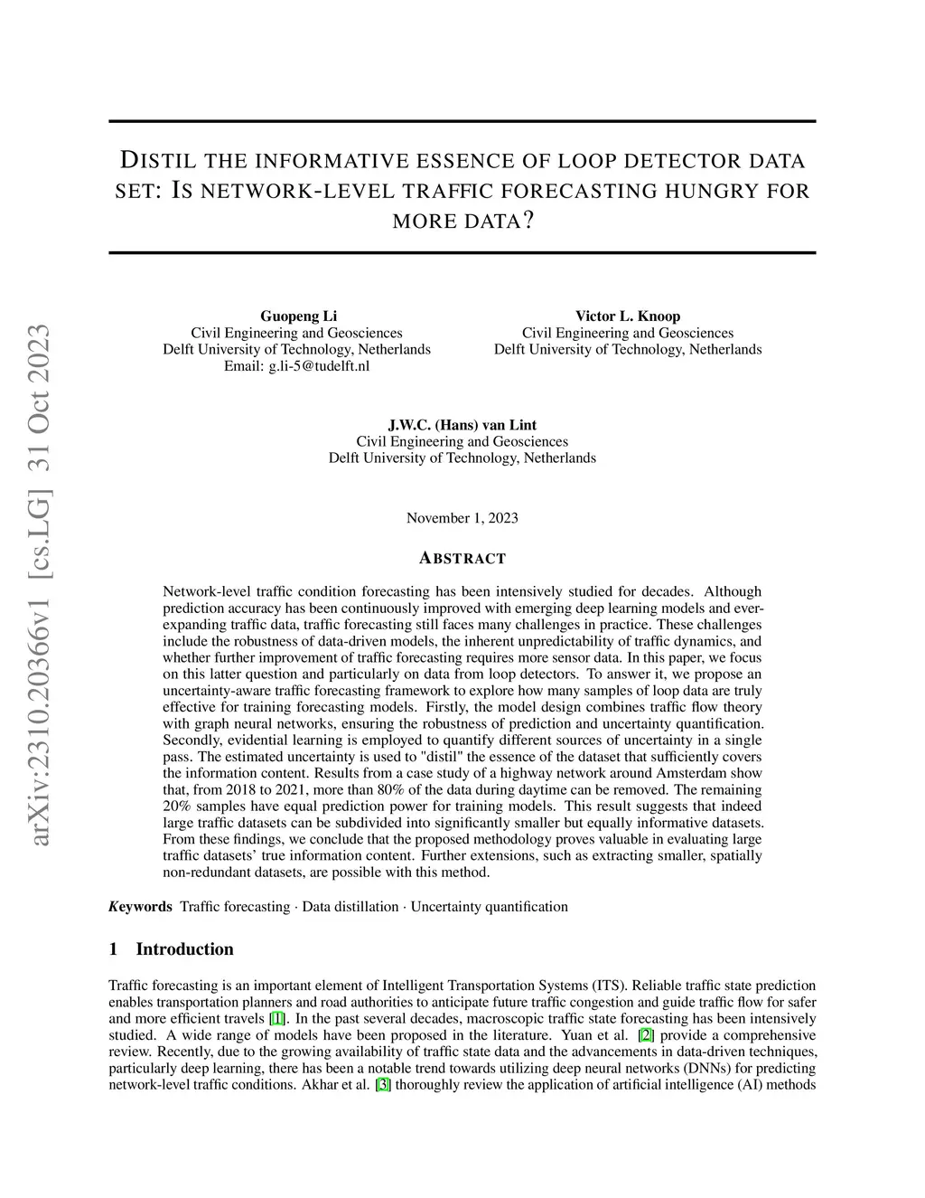 Network-level traffic condition forecasting has been intensively studied for decades. Although prediction accuracy has been continuously improved with emerging deep learning models and ever-expanding traffic data, traffic forecasting still faces many challenges in practice. These challenges include the robustness of data-driven models, the inherent unpredictability of traffic dynamics, and whether further improvement of traffic forecasting requires more sensor data. In this paper, we focus on this latter question and particularly on data from loop detectors. To answer this, we propose an uncertainty-aware traffic forecasting framework to explore how many samples of loop data are truly effective for training forecasting models. Firstly, the model design combines traffic flow theory with graph neural networks, ensuring the robustness of prediction and uncertainty quantification. Secondly, evidential learning is employed to quantify different sources of uncertainty in a single pass. The estimated uncertainty is used to "distil" the essence of the dataset that sufficiently covers the information content. Results from a case study of a highway network around Amsterdam show that, from 2018 to 2021, more than 80\% of the data during daytime can be removed. The remaining 20\% samples have equal prediction power for training models. This result suggests that indeed large traffic datasets can be subdivided into significantly smaller but equally informative datasets. From these findings, we conclude that the proposed methodology proves valuable in evaluating large traffic datasets' true information content. Further extensions, such as extracting smaller, spatially non-redundant datasets, are possible with this method.