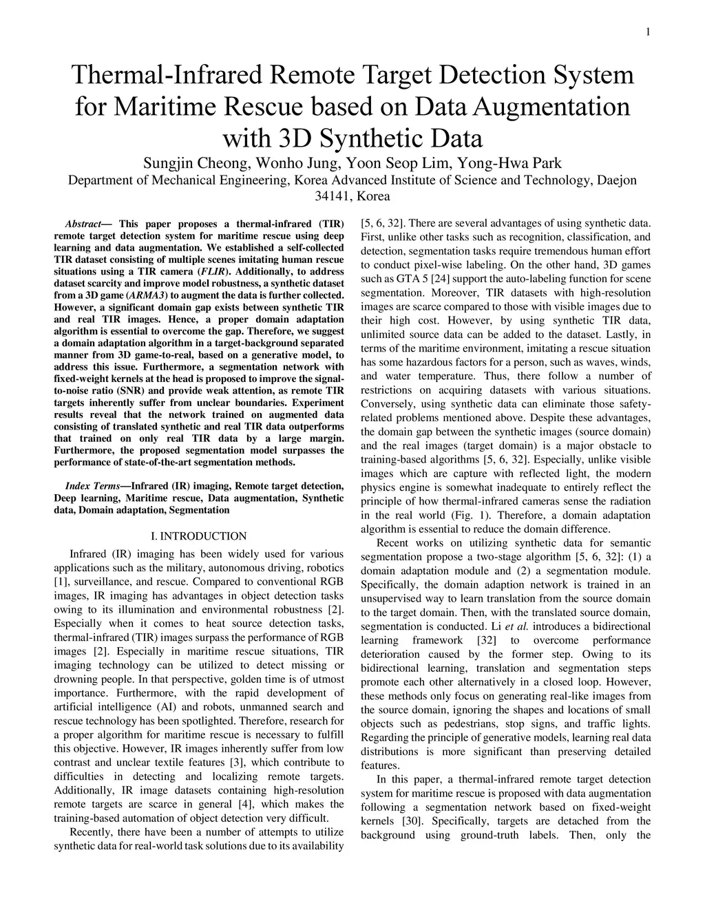 This paper proposes a thermal-infrared (TIR) remote target detection system for maritime rescue using deep learning and data augmentation. We established a self-collected TIR dataset consisting of multiple scenes imitating human rescue situations using a TIR camera (FLIR). Additionally, to address dataset scarcity and improve model robustness, a synthetic dataset from a 3D game (ARMA3) to augment the data is further collected. However, a significant domain gap exists between synthetic TIR and real TIR images. Hence, a proper domain adaptation algorithm is essential to overcome the gap. Therefore, we suggest a domain adaptation algorithm in a target-background separated manner from 3D game-to-real, based on a generative model, to address this issue. Furthermore, a segmentation network with fixed-weight kernels at the head is proposed to improve the signal-to-noise ratio (SNR) and provide weak attention, as remote TIR targets inherently suffer from unclear boundaries. Experiment results reveal that the network trained on augmented data consisting of translated synthetic and real TIR data outperforms that trained on only real TIR data by a large margin. Furthermore, the proposed segmentation model surpasses the performance of state-of-the-art segmentation methods.