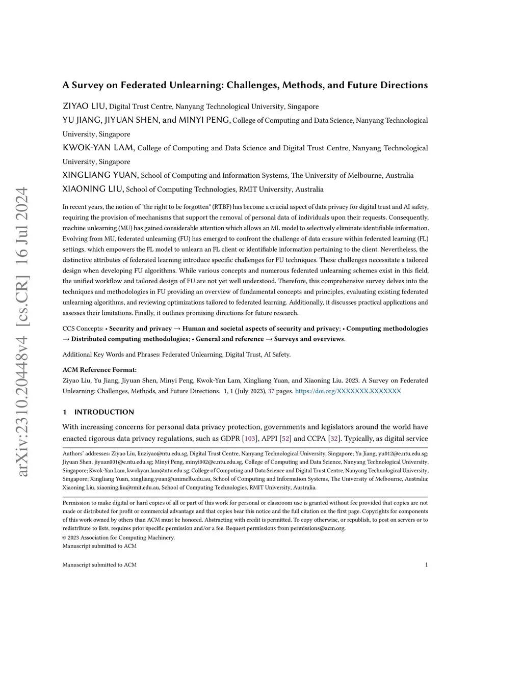 In recent years, the notion of ``the right to be forgotten" (RTBF) has become a crucial aspect of data privacy for digital trust and AI safety, requiring the provision of mechanisms that support the removal of personal data of individuals upon their requests. Consequently, machine unlearning (MU) has gained considerable attention which allows an ML model to selectively eliminate identifiable information. Evolving from MU, federated unlearning (FU) has emerged to confront the challenge of data erasure within federated learning (FL) settings, which empowers the FL model to unlearn an FL client or identifiable information pertaining to the client. Nevertheless, the distinctive attributes of federated learning introduce specific challenges for FU techniques. These challenges necessitate a tailored design when developing FU algorithms. While various concepts and numerous federated unlearning schemes exist in this field, the unified workflow and tailored design of FU are not yet well understood. Therefore, this comprehensive survey delves into the techniques and methodologies in FU providing an overview of fundamental concepts and principles, evaluating existing federated unlearning algorithms, and reviewing optimizations tailored to federated learning. Additionally, it discusses practical applications and assesses their limitations. Finally, it outlines promising directions for future research.