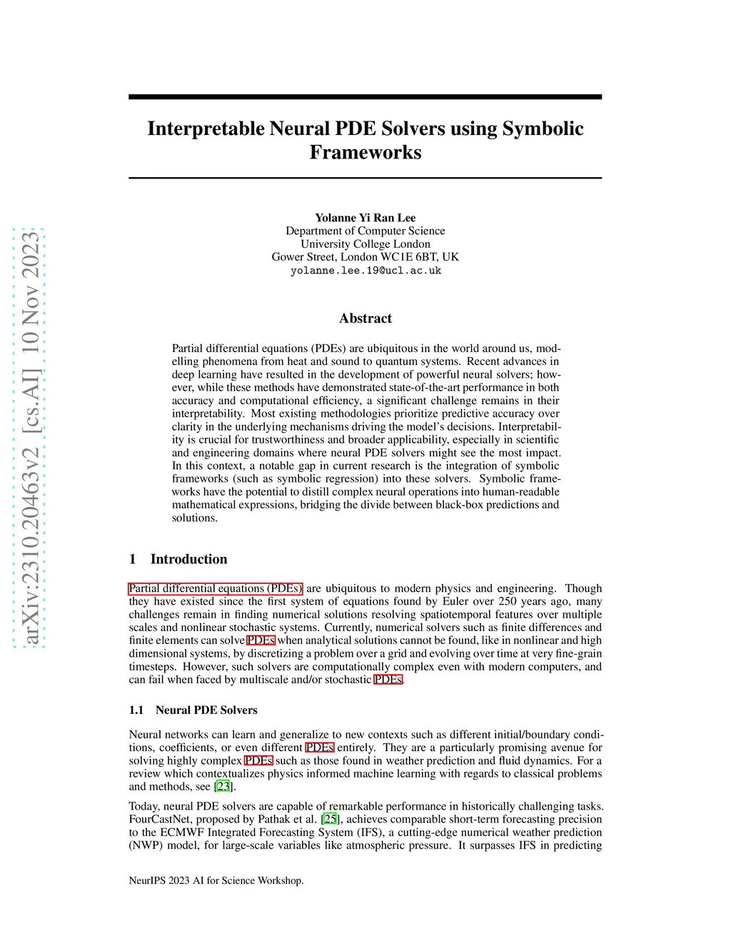 Partial differential equations (PDEs) are ubiquitous in the world around us, modelling phenomena from heat and sound to quantum systems. Recent advances in deep learning have resulted in the development of powerful neural solvers; however, while these methods have demonstrated state-of-the-art performance in both accuracy and computational efficiency, a significant challenge remains in their interpretability. Most existing methodologies prioritize predictive accuracy over clarity in the underlying mechanisms driving the model's decisions. Interpretability is crucial for trustworthiness and broader applicability, especially in scientific and engineering domains where neural PDE solvers might see the most impact. In this context, a notable gap in current research is the integration of symbolic frameworks (such as symbolic regression) into these solvers. Symbolic frameworks have the potential to distill complex neural operations into human-readable mathematical expressions, bridging the divide between black-box predictions and solutions.