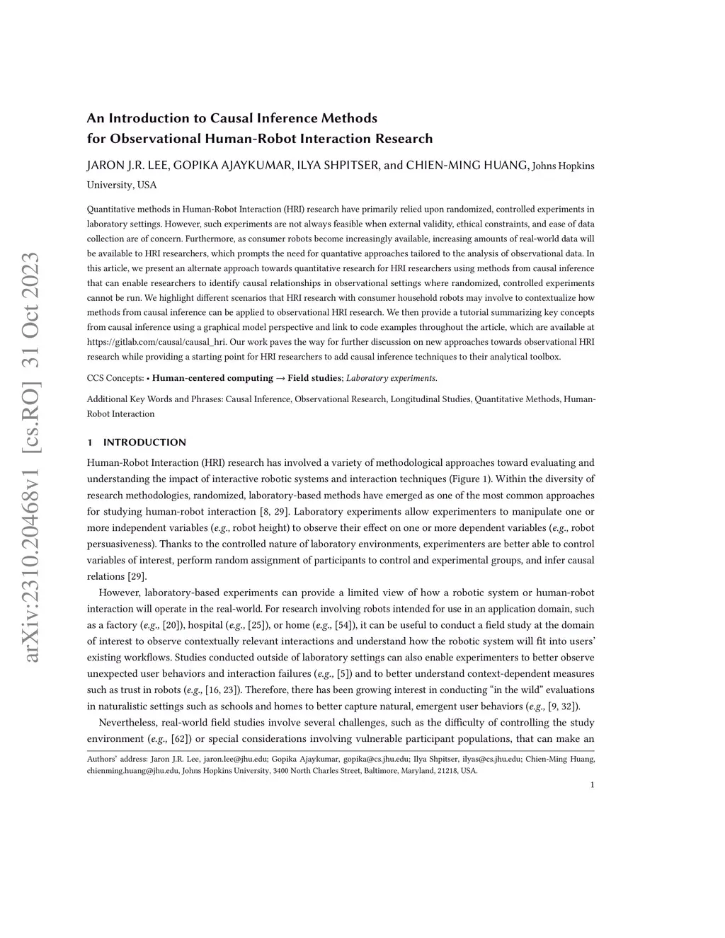 Quantitative methods in Human-Robot Interaction (HRI) research have primarily relied upon randomized, controlled experiments in laboratory settings. However, such experiments are not always feasible when external validity, ethical constraints, and ease of data collection are of concern. Furthermore, as consumer robots become increasingly available, increasing amounts of real-world data will be available to HRI researchers, which prompts the need for quantative approaches tailored to the analysis of observational data. In this article, we present an alternate approach towards quantitative research for HRI researchers using methods from causal inference that can enable researchers to identify causal relationships in observational settings where randomized, controlled experiments cannot be run. We highlight different scenarios that HRI research with consumer household robots may involve to contextualize how methods from causal inference can be applied to observational HRI research. We then provide a tutorial summarizing key concepts from causal inference using a graphical model perspective and link to code examples throughout the article, which are available at https://gitlab.com/causal/causal_hri. Our work paves the way for further discussion on new approaches towards observational HRI research while providing a starting point for HRI researchers to add causal inference techniques to their analytical toolbox.