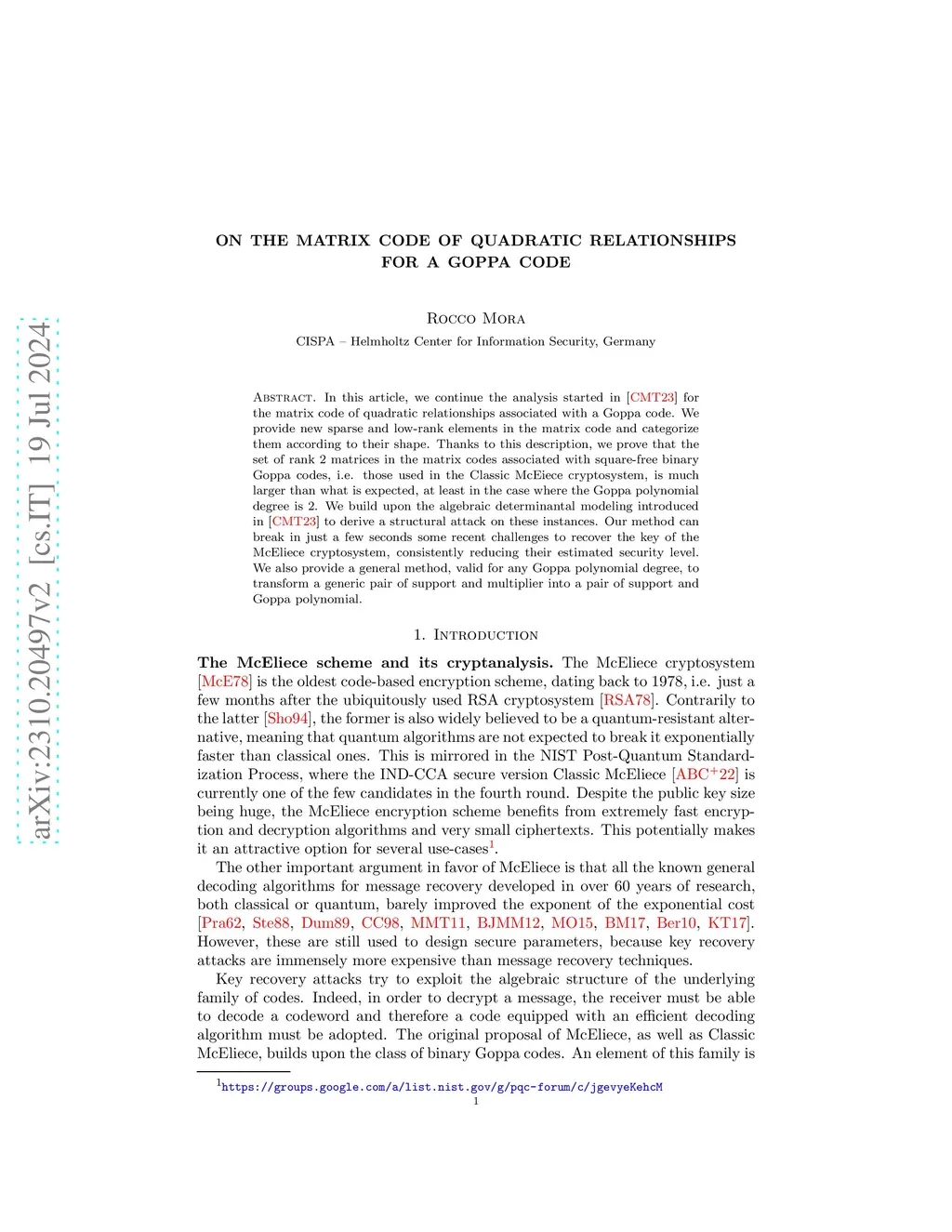 In this article, we continue the analysis started in \cite{CMT23} for the matrix code of quadratic relationships associated with a Goppa code. We provide new sparse and low-rank elements in the matrix code and categorize them according to their shape. Thanks to this description, we prove that the set of rank 2 matrices in the matrix codes associated with square-free binary Goppa codes, i.e. those used in Classic McEiece, is much larger than what is expected, at least in the case where the Goppa polynomial degree is 2. We build upon the algebraic determinantal modeling introduced in \cite{CMT23} to derive a structural attack on these instances. Our method can break in just a few seconds some recent challenges about key-recovery attacks on the McEliece cryptosystem, consistently reducing their estimated security level. We also provide a general method, valid for any Goppa polynomial degree, to transform a generic pair of support and multiplier into a pair of support and Goppa polynomial.
