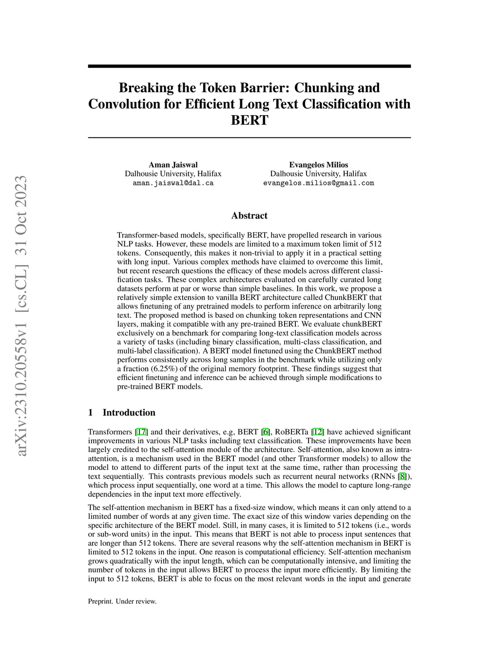 Transformer-based models, specifically BERT, have propelled research in various NLP tasks. However, these models are limited to a maximum token limit of 512 tokens. Consequently, this makes it non-trivial to apply it in a practical setting with long input. Various complex methods have claimed to overcome this limit, but recent research questions the efficacy of these models across different classification tasks. These complex architectures evaluated on carefully curated long datasets perform at par or worse than simple baselines. In this work, we propose a relatively simple extension to vanilla BERT architecture called ChunkBERT that allows finetuning of any pretrained models to perform inference on arbitrarily long text. The proposed method is based on chunking token representations and CNN layers, making it compatible with any pre-trained BERT. We evaluate chunkBERT exclusively on a benchmark for comparing long-text classification models across a variety of tasks (including binary classification, multi-class classification, and multi-label classification). A BERT model finetuned using the ChunkBERT method performs consistently across long samples in the benchmark while utilizing only a fraction (6.25\%) of the original memory footprint. These findings suggest that efficient finetuning and inference can be achieved through simple modifications to pre-trained BERT models.