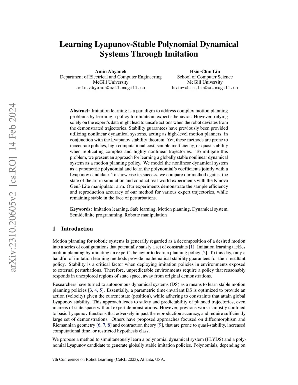Imitation learning is a paradigm to address complex motion planning problems by learning a policy to imitate an expert's behavior. However, relying solely on the expert's data might lead to unsafe actions when the robot deviates from the demonstrated trajectories. Stability guarantees have previously been provided utilizing nonlinear dynamical systems, acting as high-level motion planners, in conjunction with the Lyapunov stability theorem. Yet, these methods are prone to inaccurate policies, high computational cost, sample inefficiency, or quasi stability when replicating complex and highly nonlinear trajectories. To mitigate this problem, we present an approach for learning a globally stable nonlinear dynamical system as a motion planning policy. We model the nonlinear dynamical system as a parametric polynomial and learn the polynomial's coefficients jointly with a Lyapunov candidate. To showcase its success, we compare our method against the state of the art in simulation and conduct real-world experiments with the Kinova Gen3 Lite manipulator arm. Our experiments demonstrate the sample efficiency and reproduction accuracy of our method for various expert trajectories, while remaining stable in the face of perturbations.