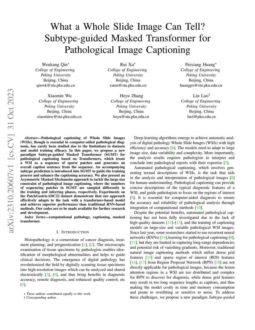 Pathological captioning of Whole Slide Images (WSIs), though is essential in computer-aided pathological diagnosis, has rarely been studied due to the limitations in datasets and model training efficacy. In this paper, we propose a new paradigm Subtype-guided Masked Transformer (SGMT) for pathological captioning based on Transformers, which treats a WSI as a sequence of sparse patches and generates an overall caption sentence from the sequence. An accompanying subtype prediction is introduced into SGMT to guide the training process and enhance the captioning accuracy. We also present an Asymmetric Masked Mechansim approach to tackle the large size constraint of pathological image captioning, where the numbers of sequencing patches in SGMT are sampled differently in the training and inferring phases, respectively. Experiments on the PatchGastricADC22 dataset demonstrate that our approach effectively adapts to the task with a transformer-based model and achieves superior performance than traditional RNN-based methods. Our codes are to be made available for further research and development.