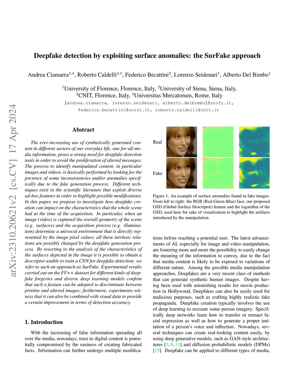 Deepfake detection by exploiting surface anomalies: the SurFake approach